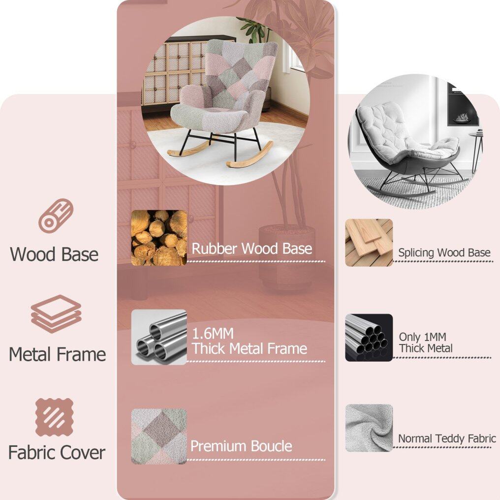Comfy Upholstered Seat: Experience ultimate comfort with this rocking chair, which is filled with elastic sponge and covered in premium boucle fabric. The upholstery promotes breathability and provides a plush seating experience. And the side pocket brings more convenience to you.