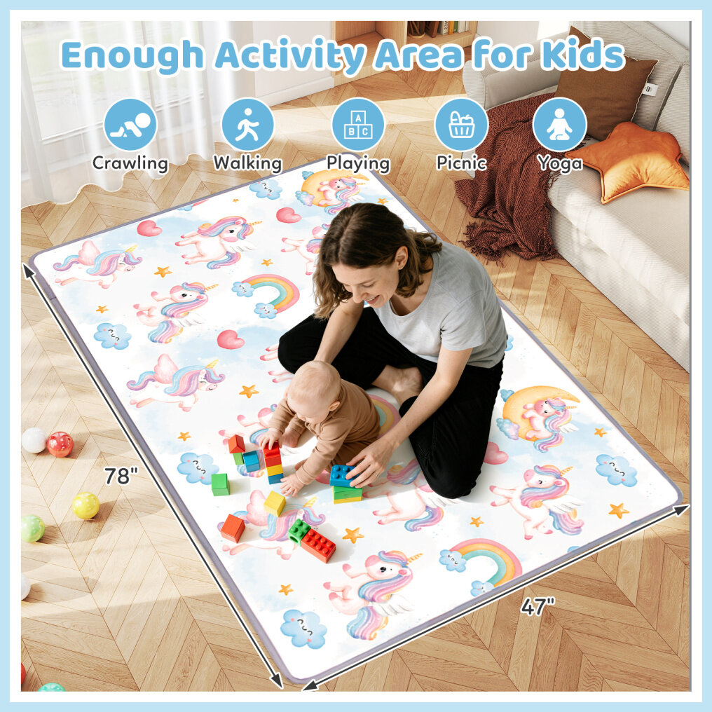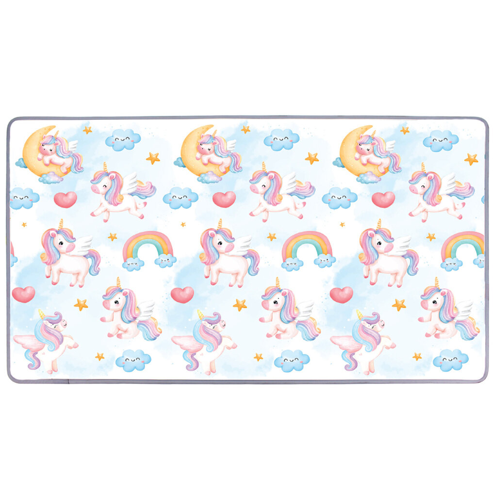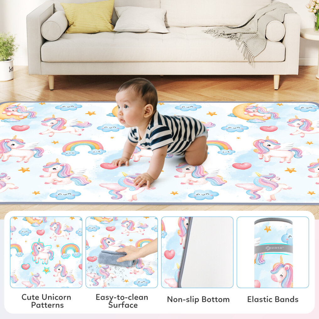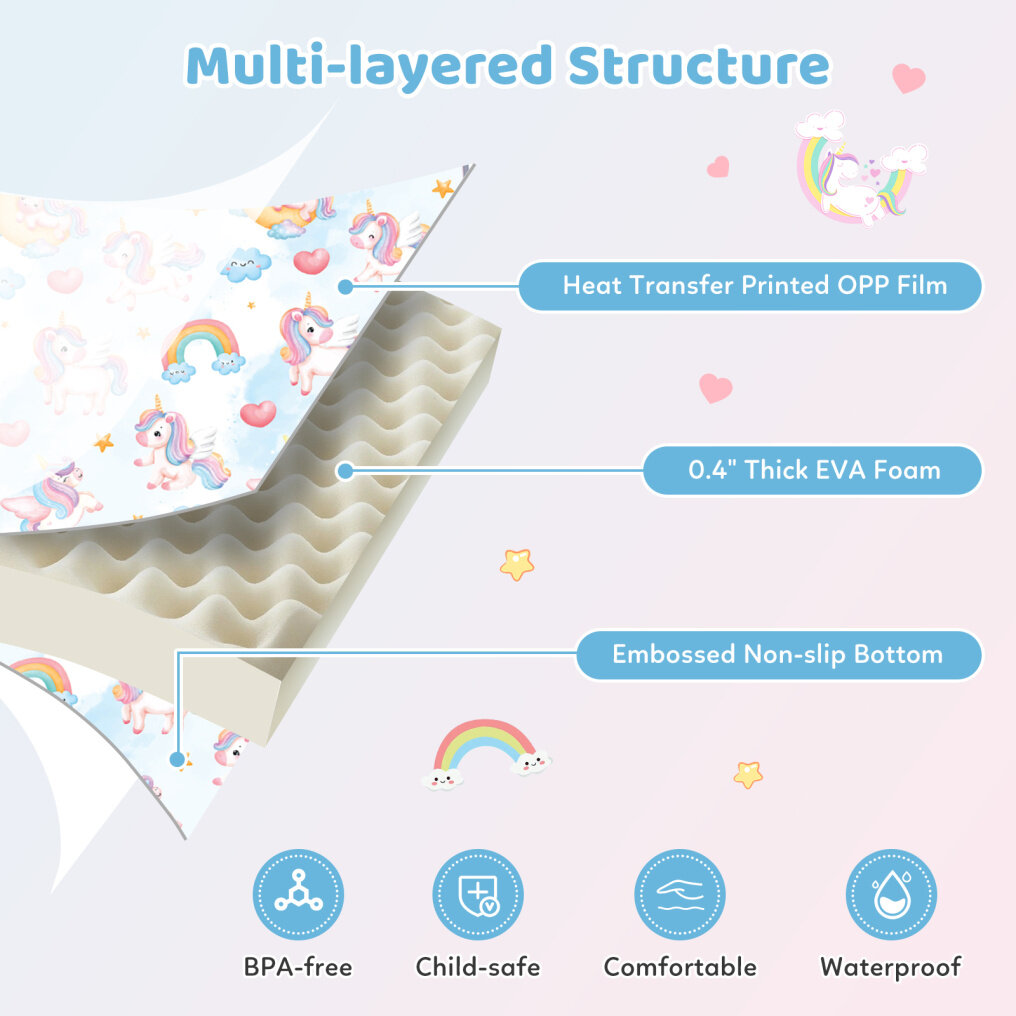 ● Reversible One-Piece Design: One side of this toddler activity mat comes with colorful unicorn printing that adds playful charm and stimulates your child's imagination. While the opposite side features white foam with an embossed anti-slip texture to provide extra grip and safety.