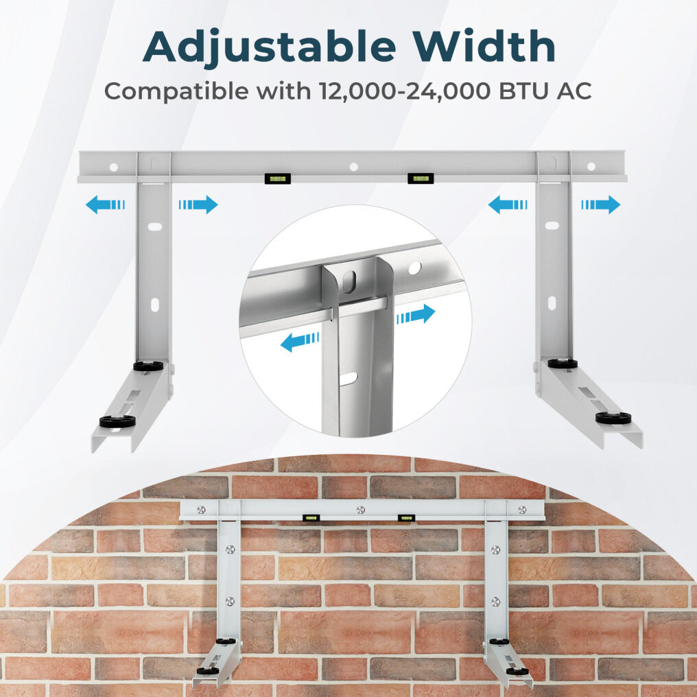 ● Universal Compatibility: This wall mount bracket is compatible with 12000-24000 BTU AC. Its adjustable with allows for precise positioning, accommodating various sizes and making it a versatile solution for most outdoor AC units. It fits various wall types, such as brick wall, concrete wall, stone wall and wood wall.
