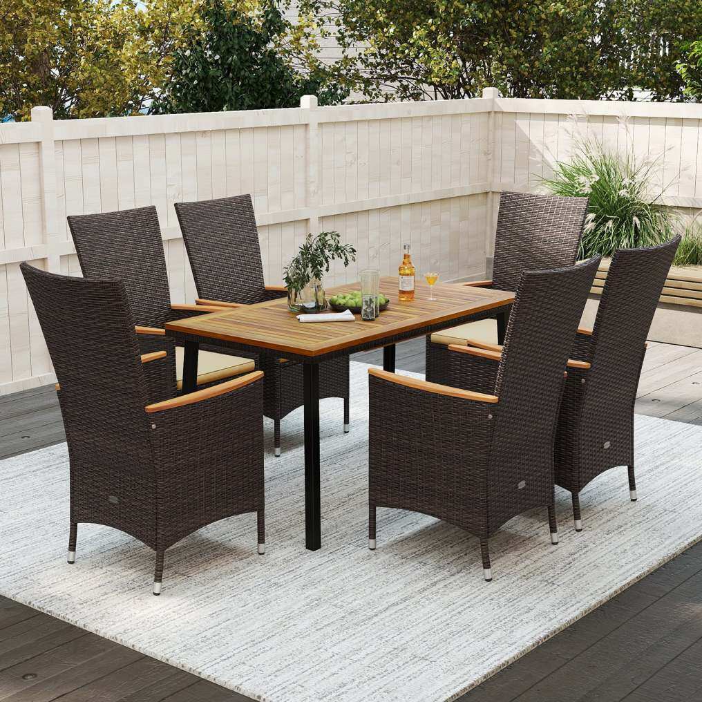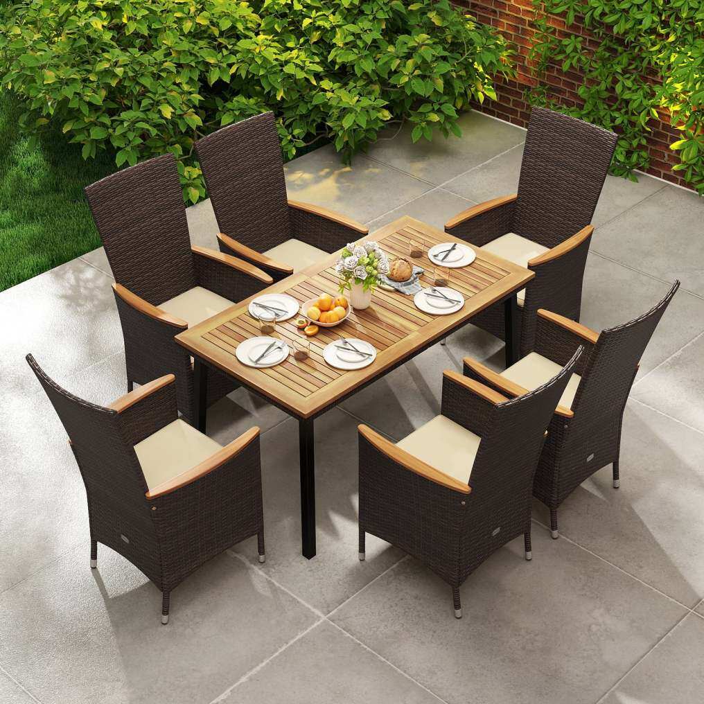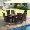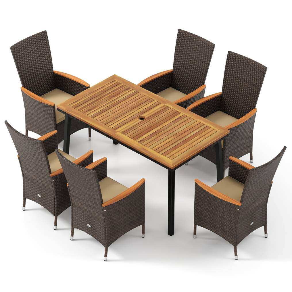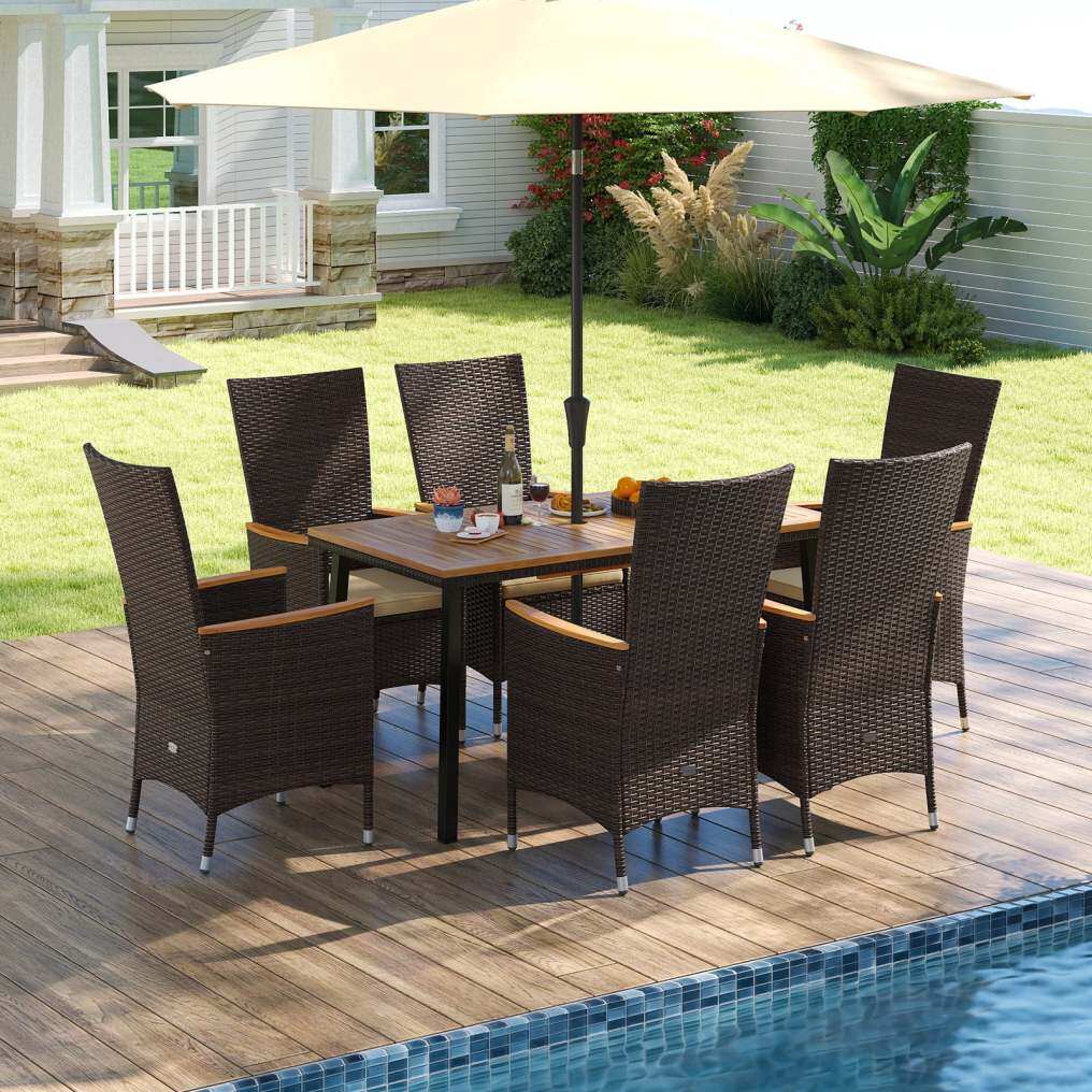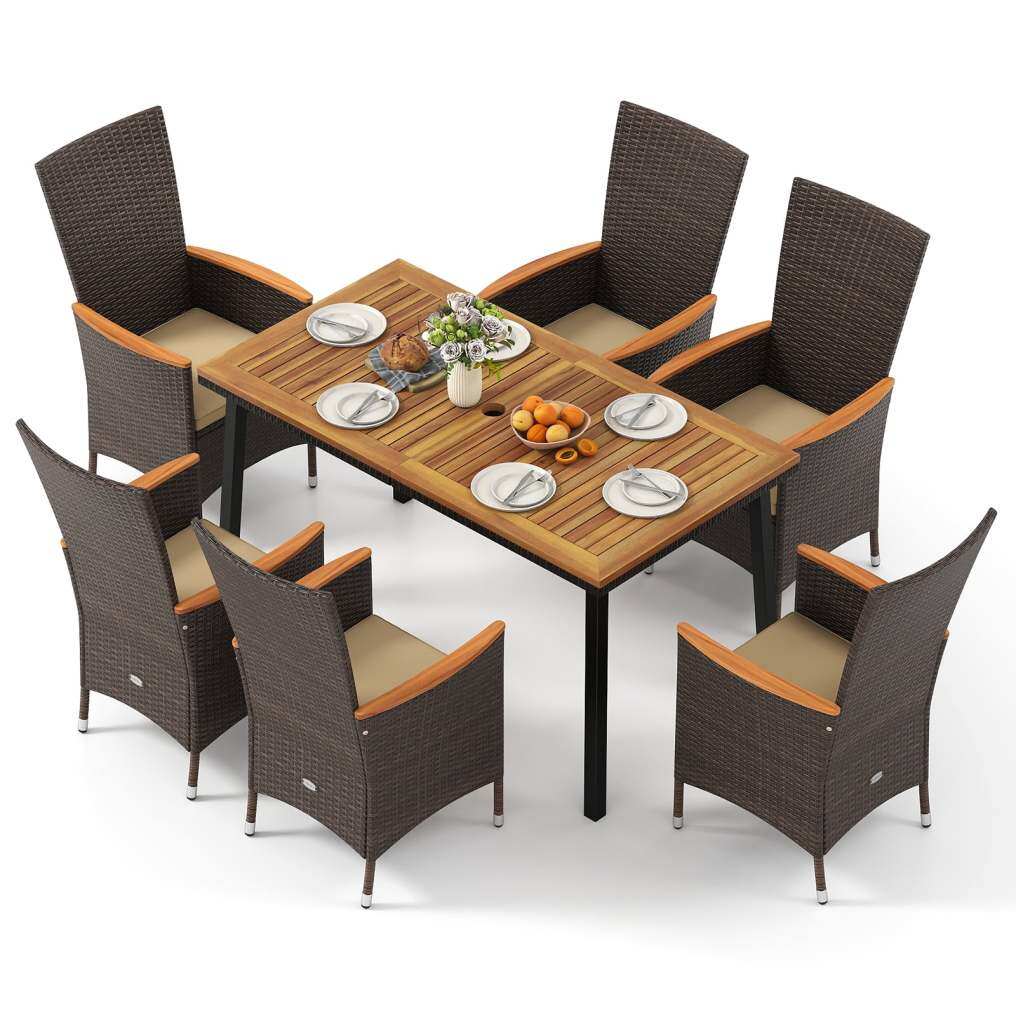 ● Sunshade Ready Design: The 55” x 29.5” spacious table can hold a variety of dishes and includes a center umbrella hole with a cover for convenience. Note: An umbrella base is required but not included. Ideal for patios, gardens, or poolside, the 7-piece rattan dining set offers enjoyable outdoor dining experiences.