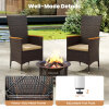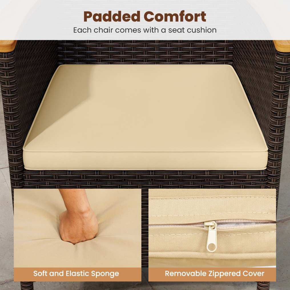 ● Cushioned Ergonomics: Designed with ergonomics in mind, the chairs of the patio dining set boast curved armrests and high backrests for superior comfort. Each seat includes a cushion with a removable zippered cover for extra softness and easy cleaning.