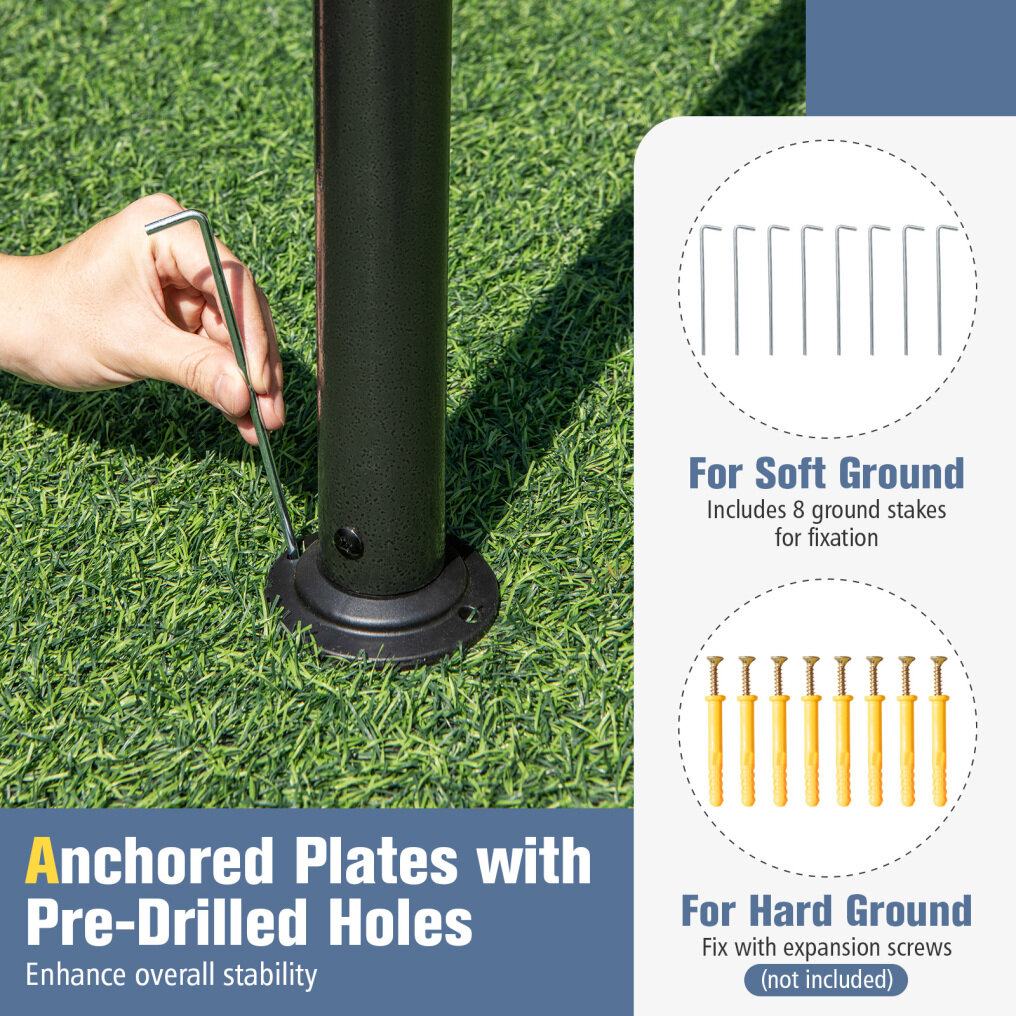Sturdy and Stable Metal Frame: The metal frame of this garden pavilion is sturdy and will not warp or bend easily. The base can be fixed for added stability with the 8 included ground stakes. There are 3 adjustable telescopic tubes on the corners, allowing you to easily adjust the tension of the cover.