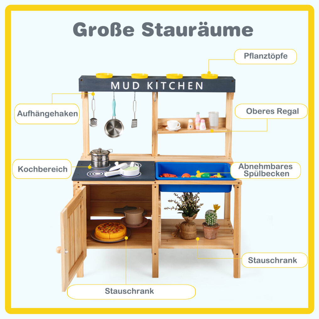 Tip-proof & solid wood materials: Crafted from solid pine and fir wood, this children's kitchen is durable. For added stability, the mud kitchen can be attached to the wall with anti-tip devices to prevent accidental tipping.