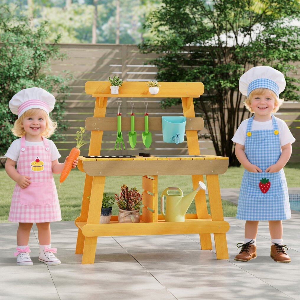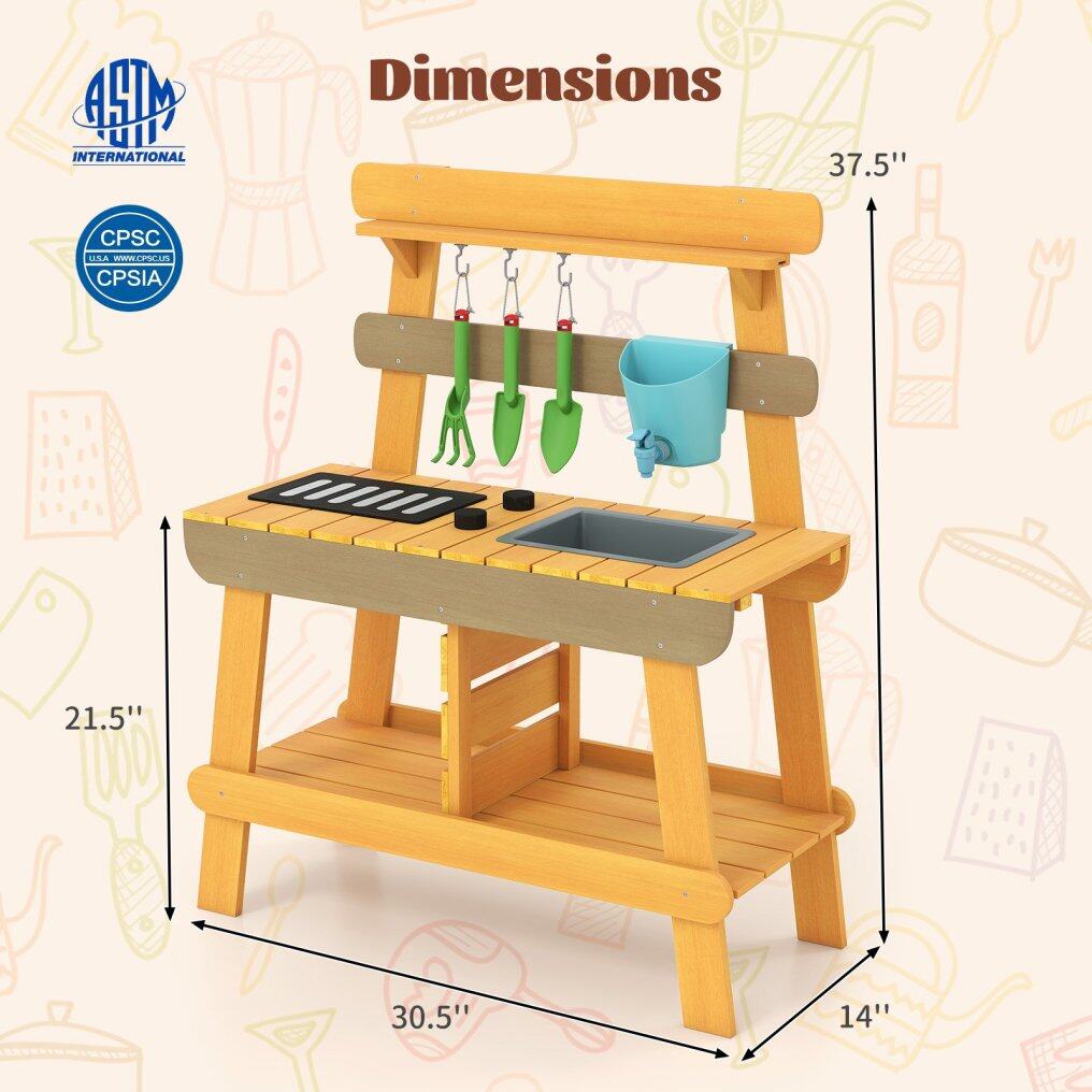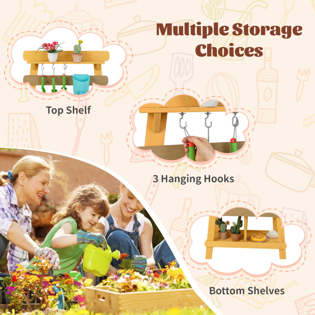● Inspire Budding Gardeners: This outdoor mud kitchen comes with gardening tools, encouraging children to develop their gardening skills and enjoy outdoor activities. The storage shelves and hanging hooks help keep accessories neat and easily accessible, promoting organizational skills.