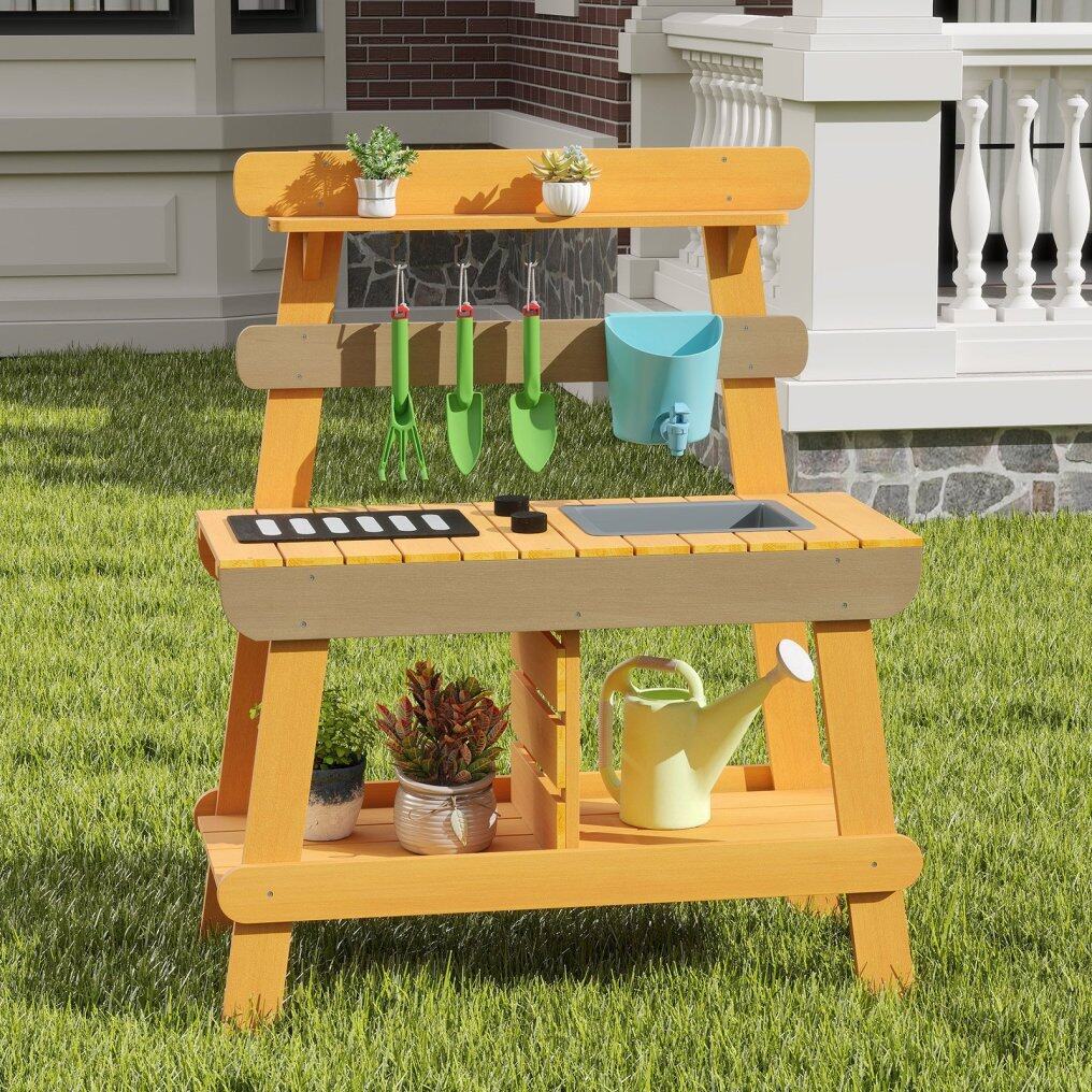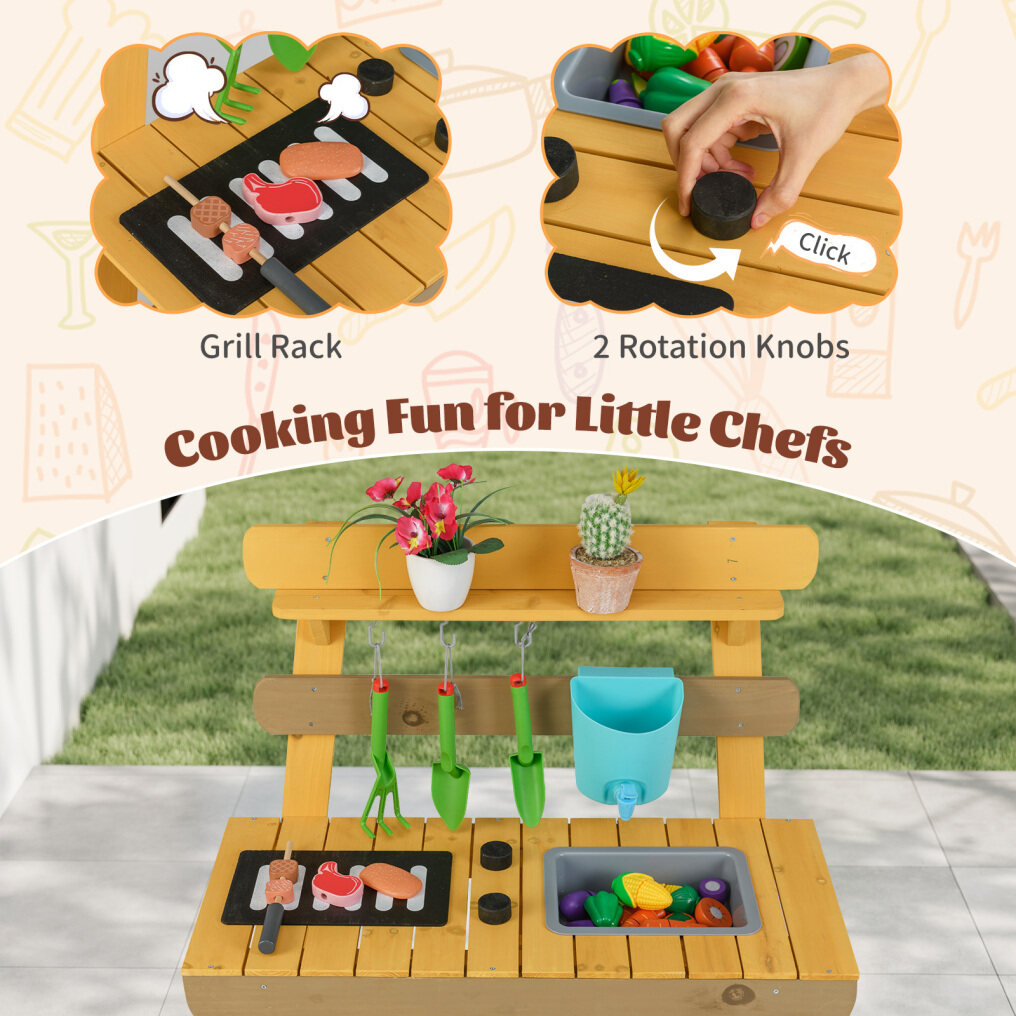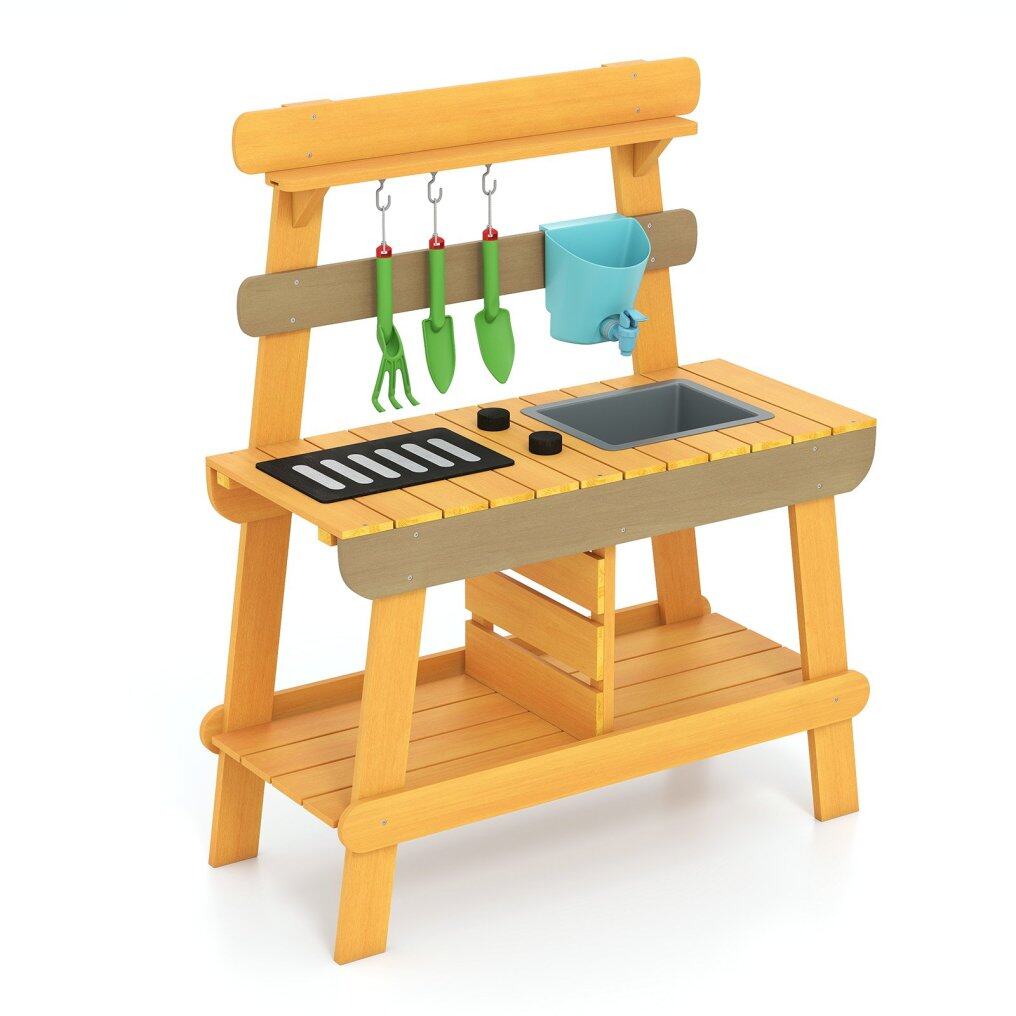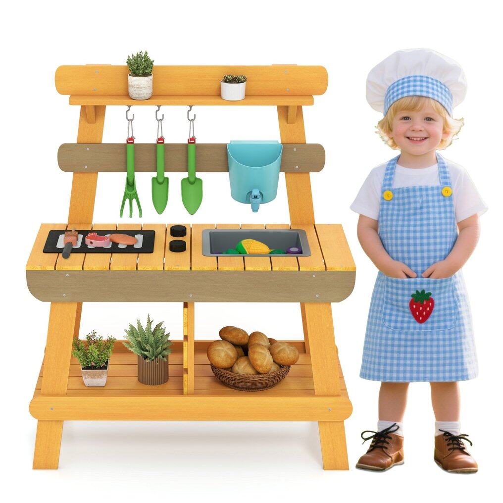 ● Inspire Budding Gardeners: This outdoor mud kitchen comes with gardening tools, encouraging children to develop their gardening skills and enjoy outdoor activities. The storage shelves and hanging hooks help keep accessories neat and easily accessible, promoting organizational skills.