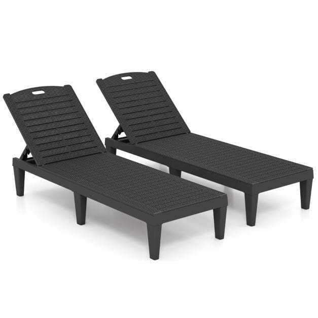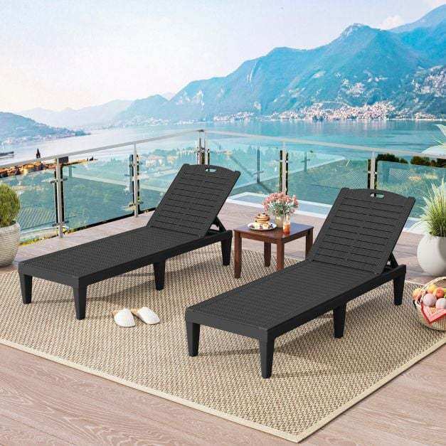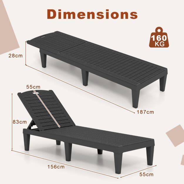 Each lounge chair features a 4-level adjustable backrest, allowing you to find the ideal angle for relaxation. Thanks to the PP rattan backrest and seat, you won't feel sweaty while sitting or lying down. These chairs create a cozy space for reading, sunbathing, playing games, listening to music, and more. Made of high-quality PP material, the chairs offer excellent weather resistance and long-term use. Furthermore, the widened legs ensure stability. Assembly is easy with a clear user manual. Once assembled, the lounge chairs can be used on patios, decks, in gardens, by the pool, etc.