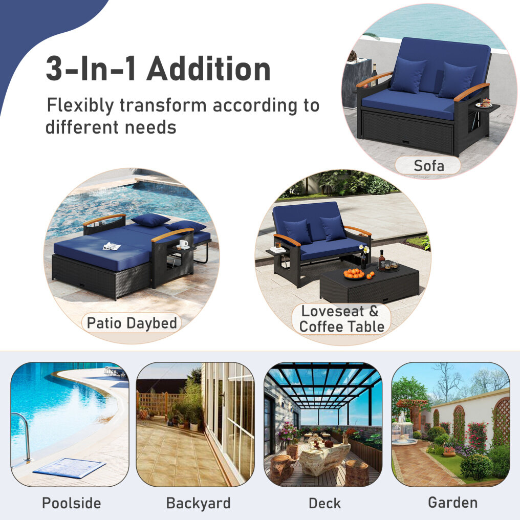 ● 3-in-1 Versatile Design: This patio rattan set includes a loveseat and an ottoman with detachable cushions. And you can use it as a conversation set, a loveseat sofa or a patio daybed as you need.
