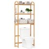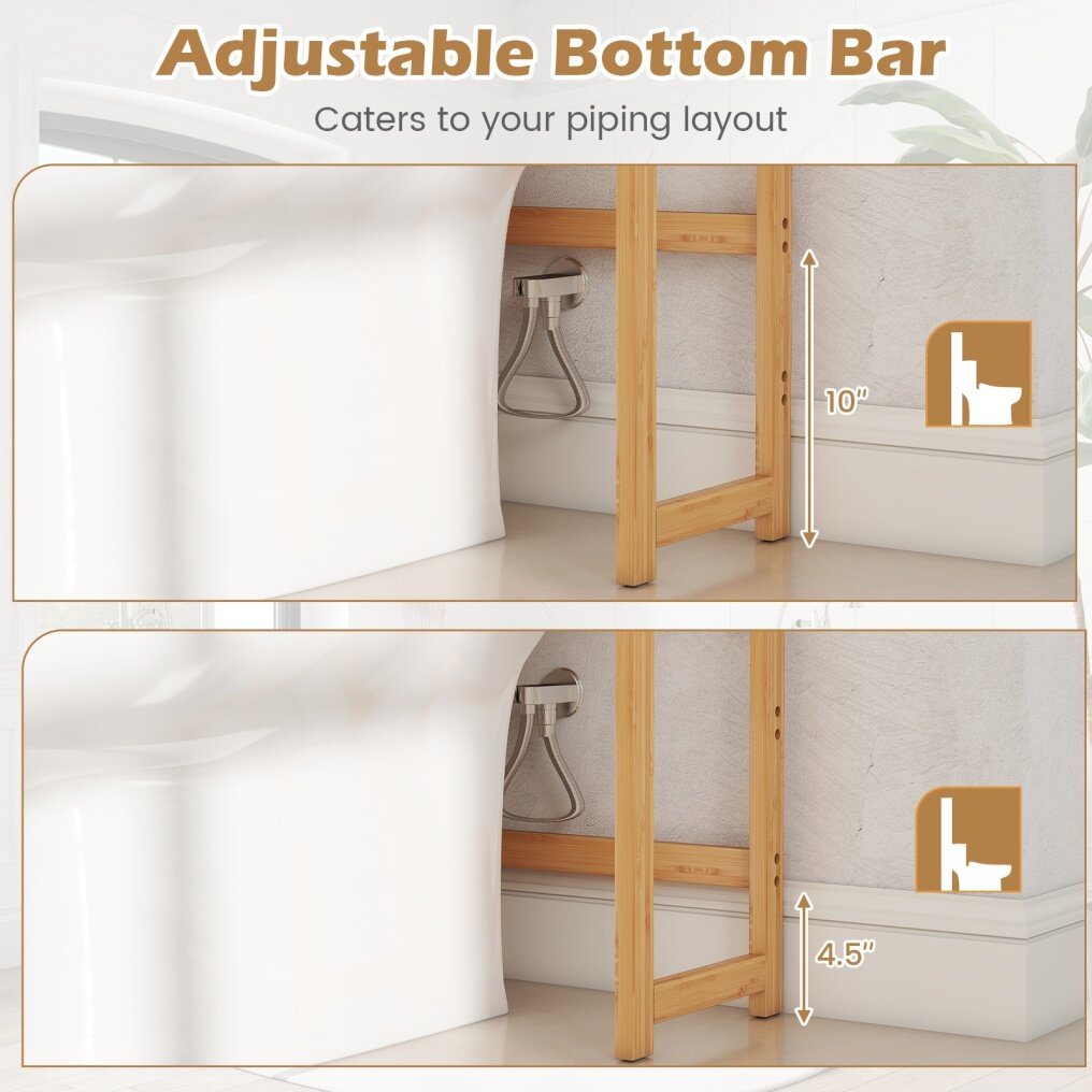 This bamboo bathroom storage rack is the perfect solution, featuring 3 adjustable shelves and 3 handy hooks, all conveniently positioned above your toilet. The bottom bar is also adjustable, ensuring a neat fit for any wall setup. You'll also love the user-friendly details: the slatted shelves help to keep your items dry, while the included anti-tipping kits and adjustable foot pads ensure stability on slippery bathroom floors. Maximize space and style with this over the toilet storage rack!