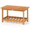 Indoor and Outdoor Use: This 2-tier coffee table seamlessly fits into indoor and outdoor space, such as patio, poolside, yard and living room. It serves as a focal point that combines beauty and practicality. For longevity, the wood furniture should be placed indoors when it rains.