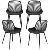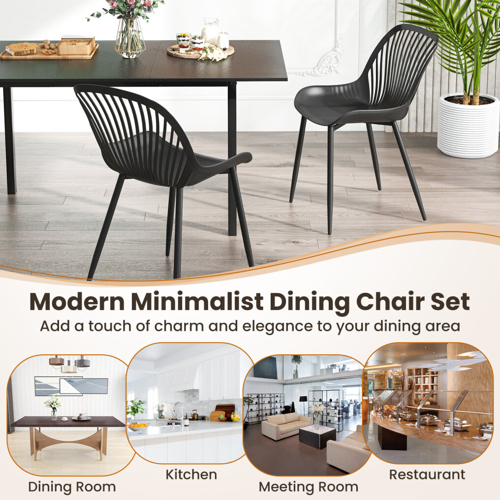 Our dining chair set includes 4 plastic chairs, and you can purchase more chairs to pair with different-sized dining tables. With its simple silhouettes and chic look, this modern minimalist dining chair set adds a touch of charm and elegance to your dining area. Constructed of high-strength metal supporting legs and high-quality PP seats, the chairs provide a sturdy and stable foundation for a secure seating experience. Additionally, the curved backrest and wide seat are designed to perfectly fit your body curve for better relaxation. The unique cutout backrest is not only aesthetically pleasing but also enhances ventilation, keeping you comfortable for hours. Whether hosting gatherings, conducting work meetings, or simply relaxing, these versatile chairs provide comfort and elegance for you and your guests.
