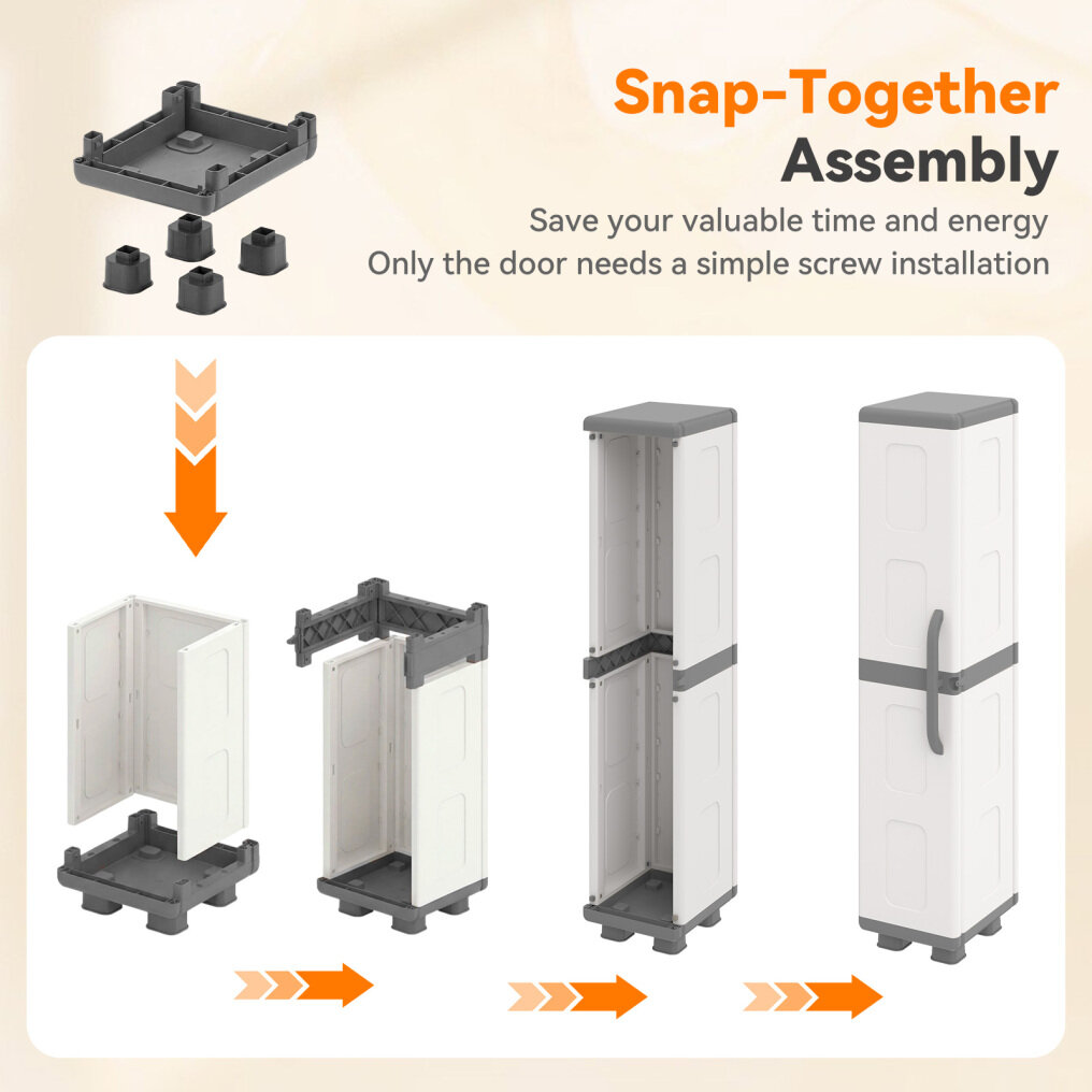 ● Snap-Together Assembly: Assembly of the entire main body of this single door pantry takes place by hand without requiring any specialized tools. Only the door needs a simple screw installation, saving your valuable time and energy.