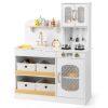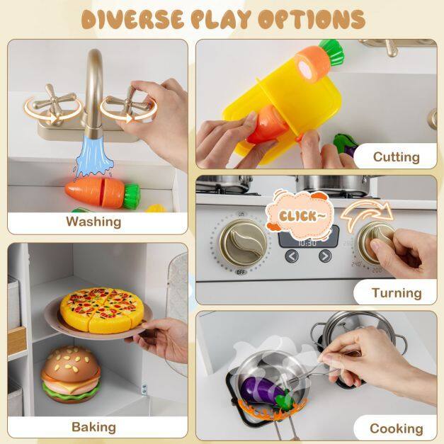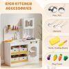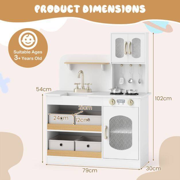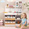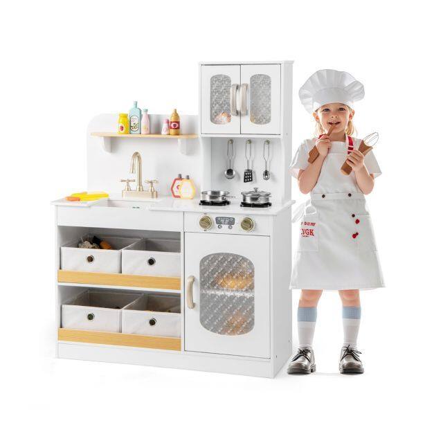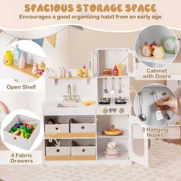 Transform your child’s playtime with this wooden play kitchen, crafted to ignite creativity and imagination. Featuring 2 simulated stovetops, a sink with a rotatable faucet, and an oven, this pretend play kitchen delivers a immersive cooking experience. Ample storage options include 4 non-woven storage bins, a cupboard, an open shelf, and 3 hanging hooks for organization. Thoughtful details like sleek handles, rounded corners, and a stable base ensure safety and style. Complete with fun accessories like a toy knife, cutting board, and play food, this toy kitchen set encourages role-play and skill-building. A perfect gift to delight kids aged 3+ with endless imaginative fun.