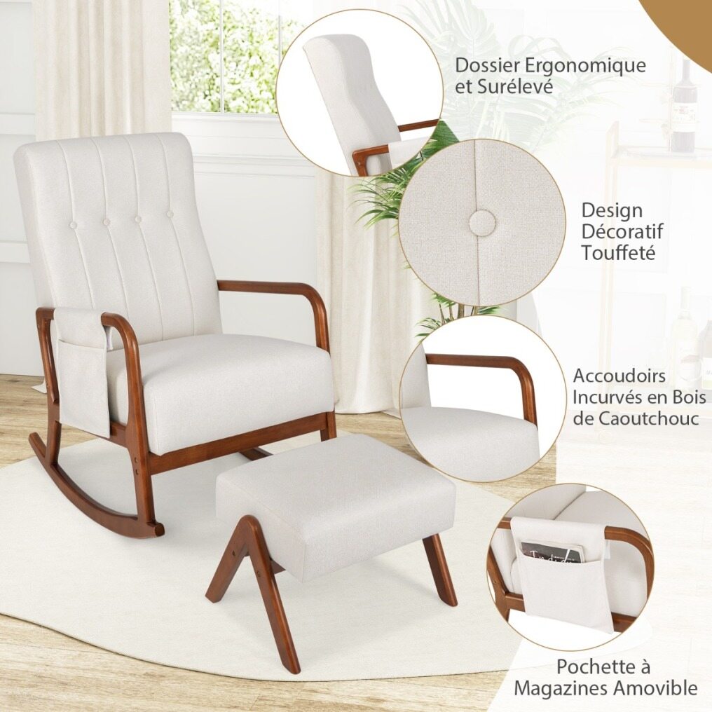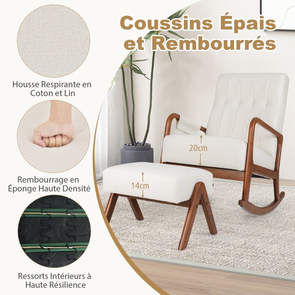 Ergonomic Design for Relaxation: The rocking chair and ottoman perfectly adapt to the natural curves of the body. The ergonomic and raised backrest optimally supports the neck, back and waist. The curved armrests and rubber wood ottoman relax the arms and legs, ensuring maximum comfort.