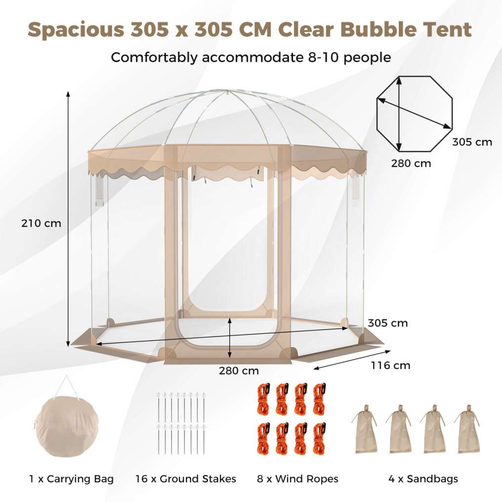 ● Spacious Gathering Haven: Enjoy the roomy comfort of this 10 x 10 ft dome tent, boasting a generous 100 sq.ft 2 interior that comfortably accommodates 8-10 people. With a 7 ft peak height and 540° panoramic crystal-clear view, it makes every outdoor get-together, family BBQ, or patio party an immersive experience.