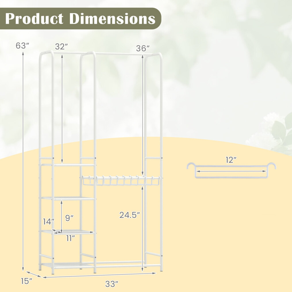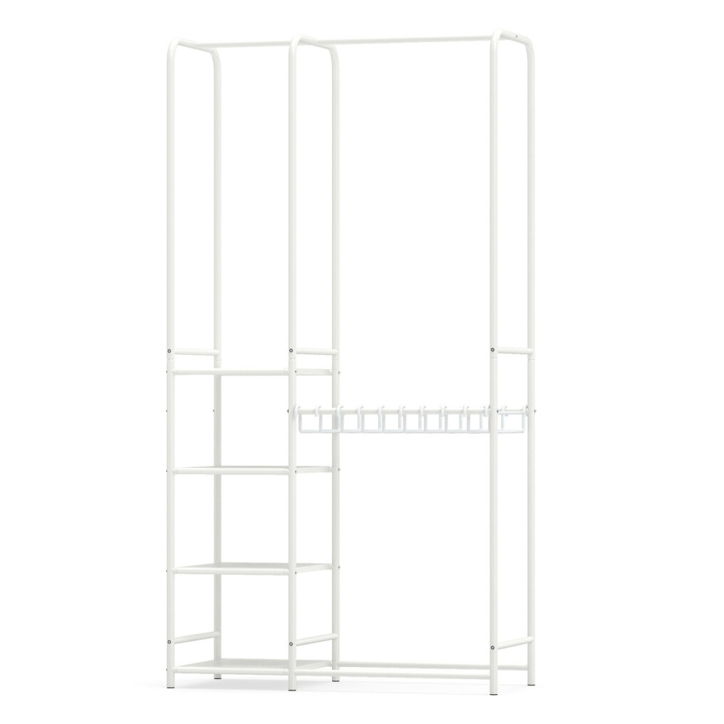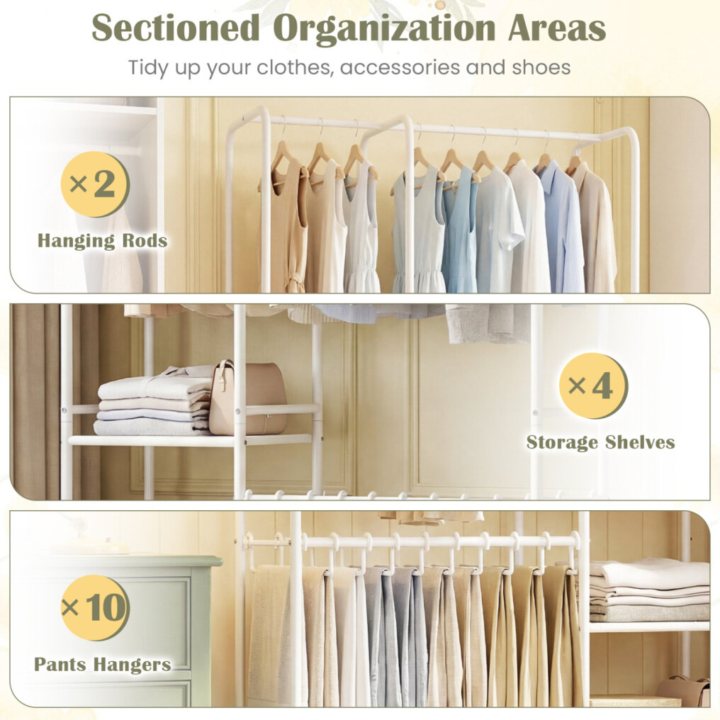 ● Flexible Pants Hanger Setup: The pants hangers on this freestanding closet organizer can be spread out or put together. Also, they are removable to suit various storage needs, offering maximum convenience depending on your clothing types and space.