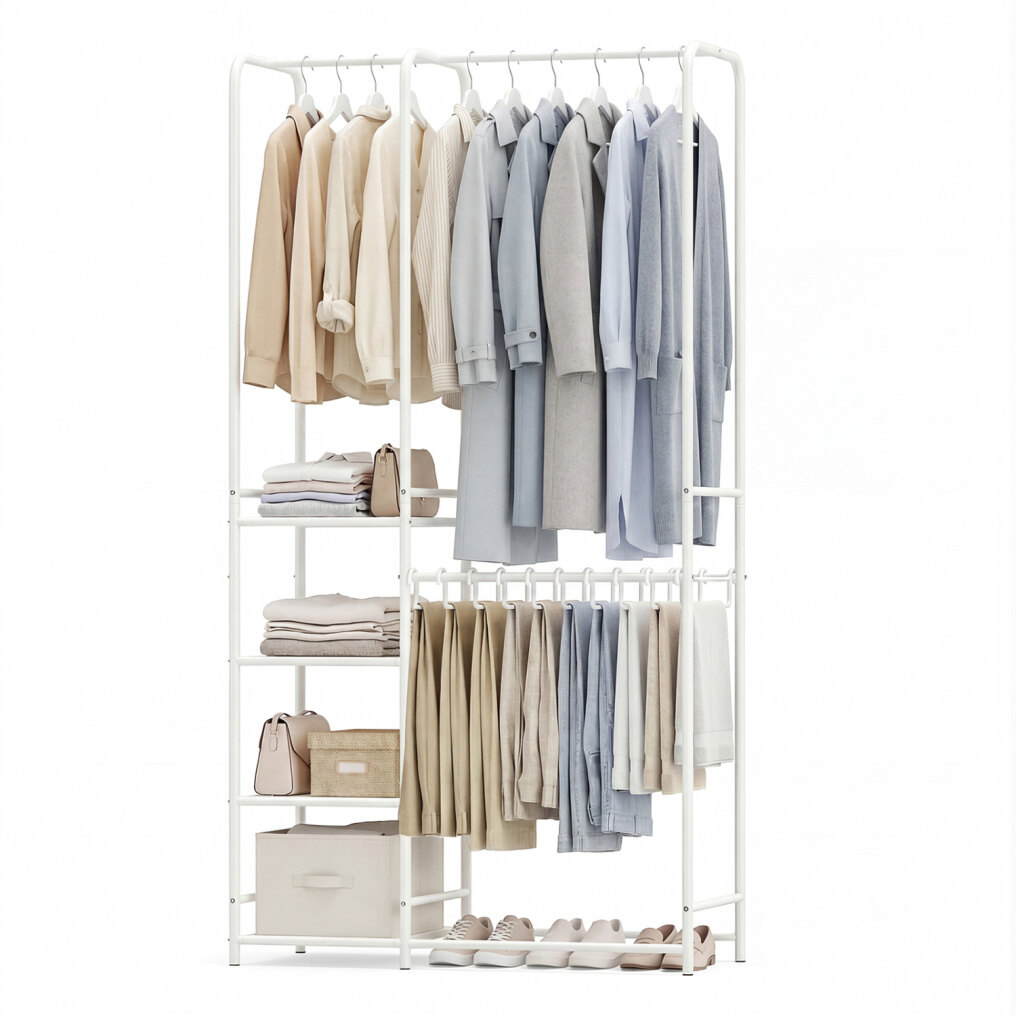 ● Multi-Scenario Practical Use: This versatile clothes rack fits perfectly into bedrooms, cloakrooms, or entryways. Its freestanding design and ample storage options make it practical for organizing garments in diverse living environments.