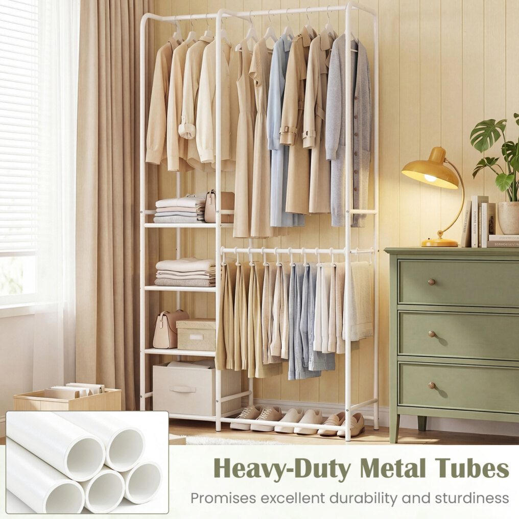 ● Long-Lasting Structural Integrity: Built from heavy-duty metal tubes, this clothing rack promises excellent durability and sturdiness. Its strong construction supports heavy garments securely, ensuring reliable use over time.