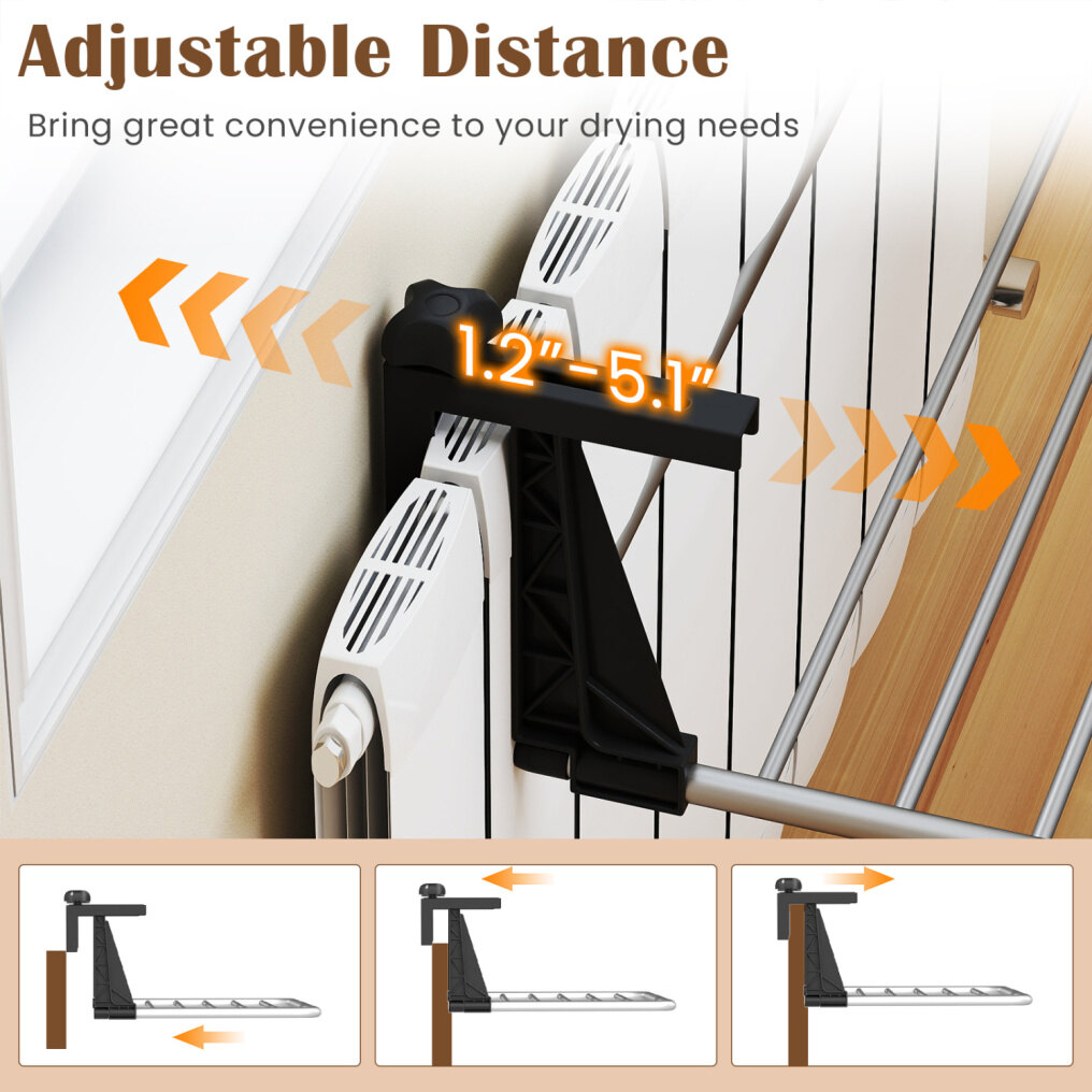 ● Adjustable Distance: This retractable clothes drying rack boasts adjustable buckles, allowing you to customize the hook length from 1.2"-5.1" to fit different widths of hanging edges, providing a secure and flexible solution that adapts to various spaces.