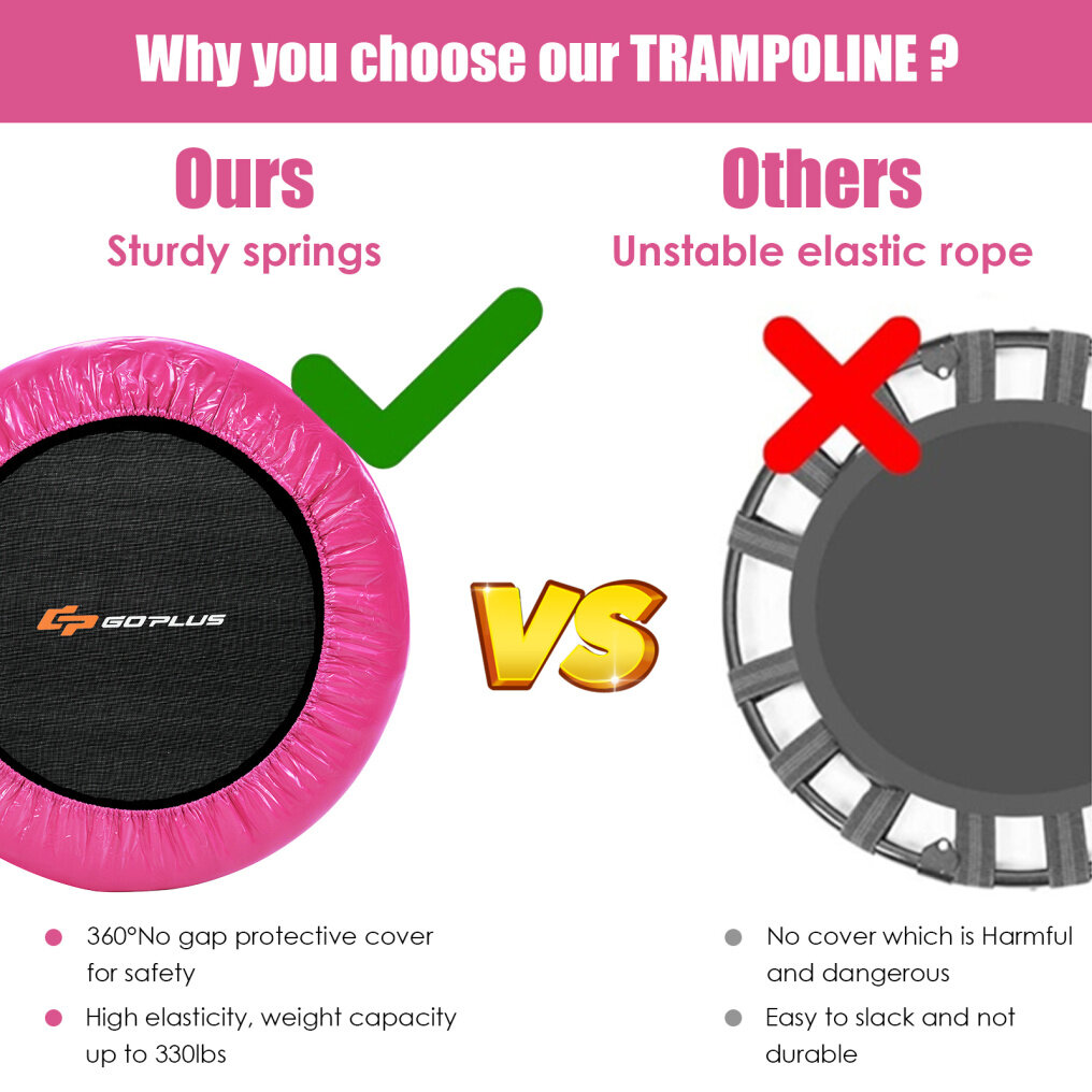 Perfect Workout Partner: This mini trampoline will provide you with brand new exercising experience. Different from the treadmill and the bike, you can enjoy purely and ultra-jumping feelings just by bouncing on the mat again and again. It is designed not only for adults who want to burn calories, but also for kids who are energetic and like doing exercises.