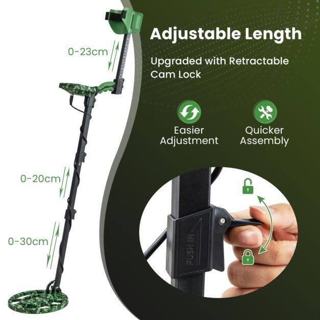 VARIOUS ADJUSTABLE PARTS: The adjustable length of 73.5cm fits users of different heights and is adjustable from 64cm to 137cm. The ergonomic bow handle with adjustable strap provides a comfortable and secure fit. The search coil with a 180° adjustable angle makes it suitable for any terrain and ground conditions.