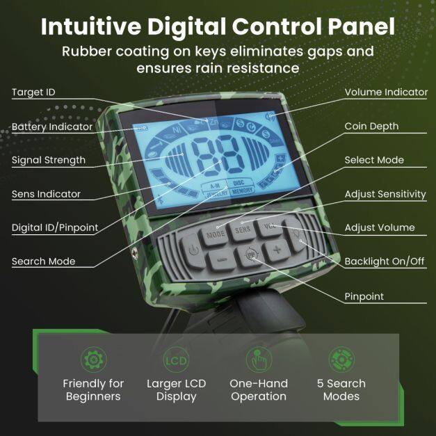 User-friendly for beginners: Upgraded with extendable comb locks, this metal detector allows for quick assembly in seconds. The intuitive digital control panel is equipped with a larger LCD display with backlight function for treasure hunting in the dark. One-handed operation makes your first experience with detection a breeze. In addition, the lightweight and foldable search coil brings more convenience for outdoor use.