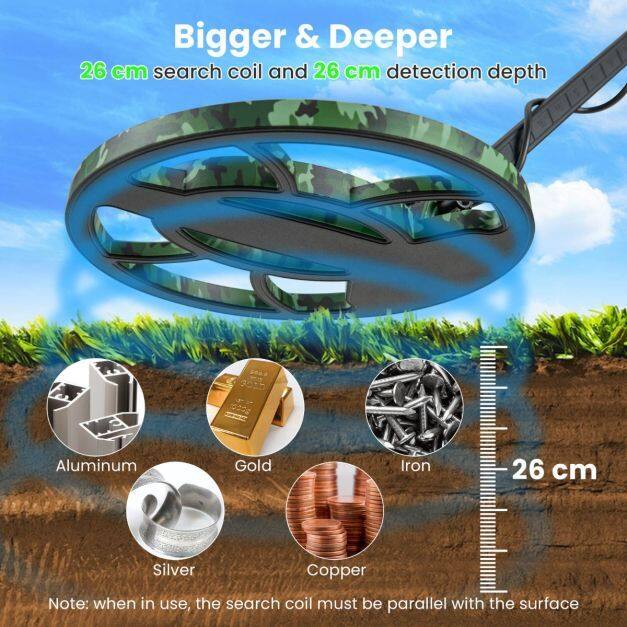 The larger search coil provides a deeper detection depth of up to 10 inches