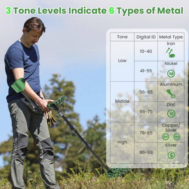 5 search modes & adjustable sensitivity: It comes with 5 search modes: All Metal Mode, DISC Mode, Jewelry Mode, PP Mode and an exclusive Memory Mode (only detects memorized metal). With 5-level adjustable sensitivity, you can adjust the sensitivity to find the target faster. 3 tone levels indicate 6 types of metals including aluminum, gold, silver, iron and copper, while the 0-99 digital ID indicator provides accurate metal detection.