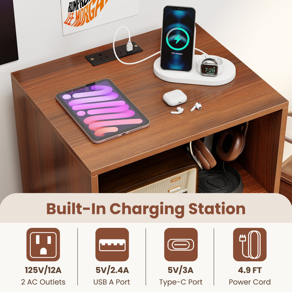 ● Integrated Charging Station: The record player stand has 2 AC outlets (125V/12A), a USB port (5V/2.4A), and a type-C port (5V/3A), so you can keep all your devices charged and ready while enjoying your favorite vinyl.
