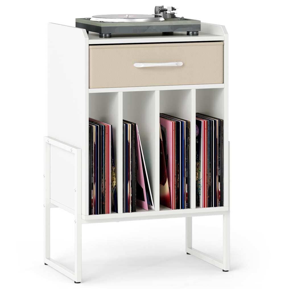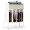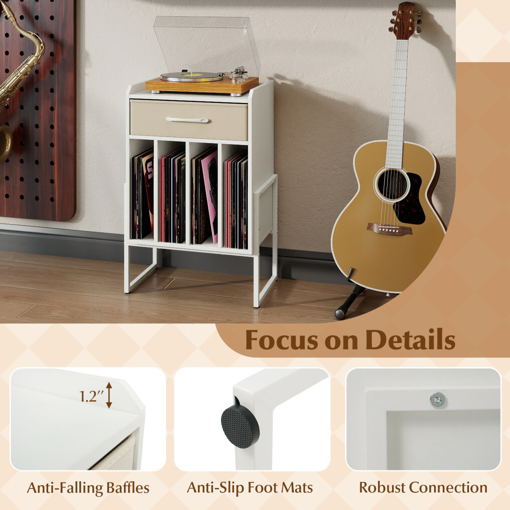 ● Ample Storage Space: Designed to enhance your audio experience, this vinyl record table features a spacious tabletop for placing turntables. With an added fabric drawer, this vinyl display shelf provides extra organized storage for your accessories.