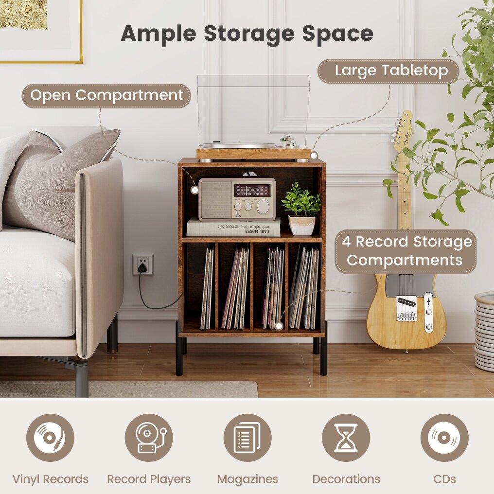 ● Ample Storage Space: This turntable stand comes with a big open compartment as well as 4 record storage compartments, which offers you ample sorting areas to organize all your records, albums, decorations, magazines, vinyl records and potted plants. Besides, the large tabletop can hold most sized turntables.