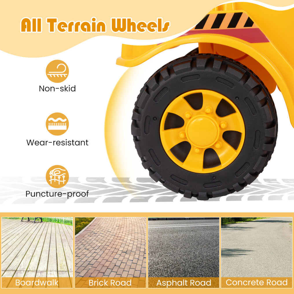 Enhanced Stability: Dive into a secure ride with the construction vehicle that boasts treaded wheels for optimal grip on multiple surfaces. Its backrest offers comfortable support and an anti-tipping block further safeguards against accidents.
