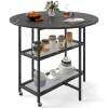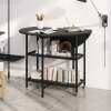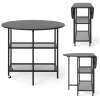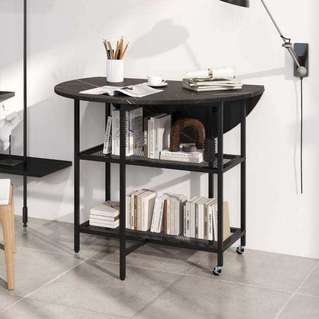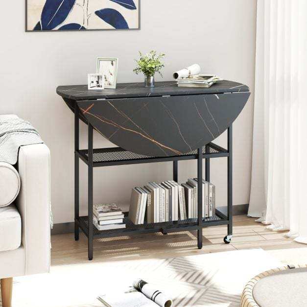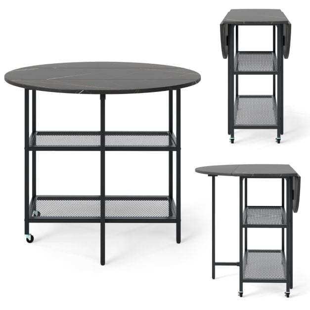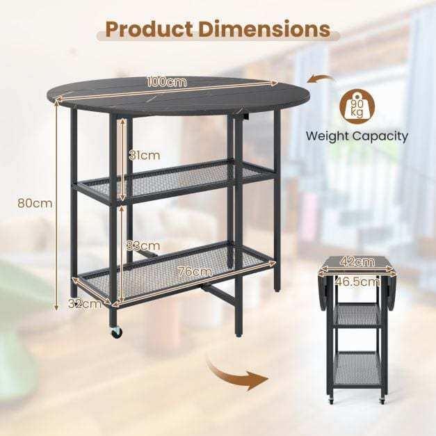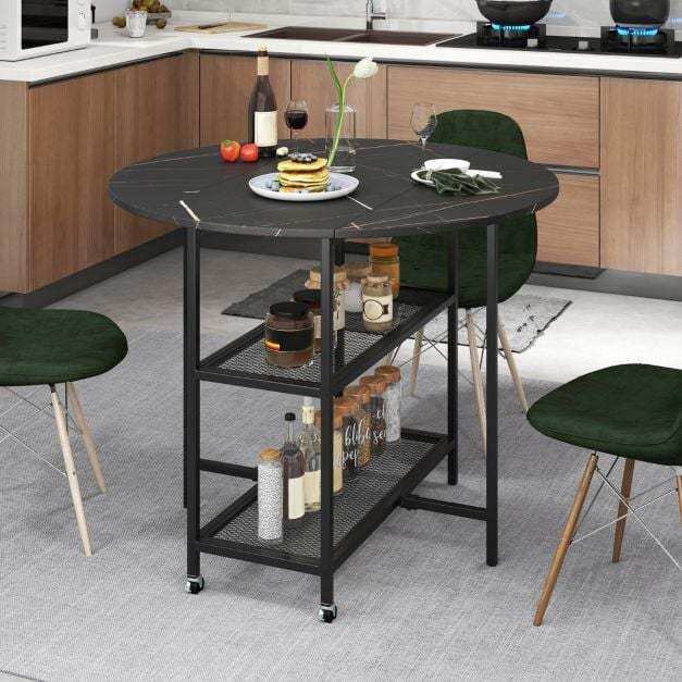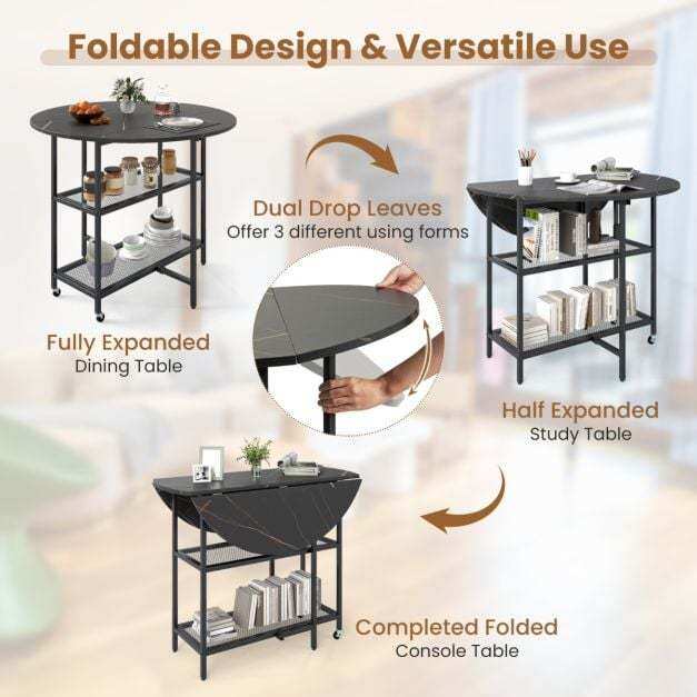 This multi-functional folding dining table boasts a 100 cm wide round tabletop with a marble-textured design for elegance. It can serve as a dining area for family gatherings, a workspace, or a display platform. With 2-tier mesh shelves and a middle storage rack, this round kitchen table conveniently stores kitchen supplies, tableware, or office supplies. The 2 lockable wheels make moving and positioning effortless, while the drop-leaf design allows it to be folded and stored against a wall. With overall dimensions of 100 x 100 x 80 cm, this modern dinette table easily fits into various home settings like the dining room or living room, meeting your needs for dining, socializing, and working.