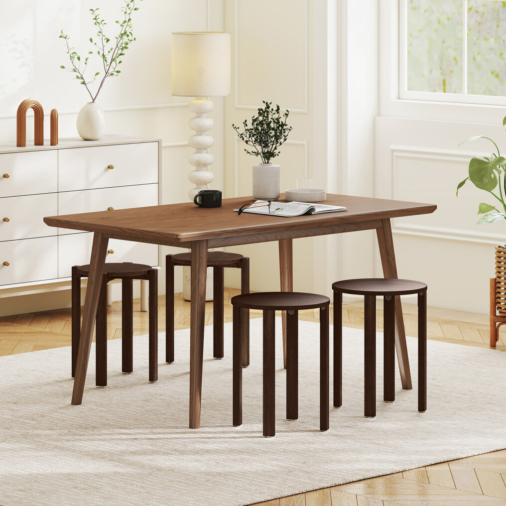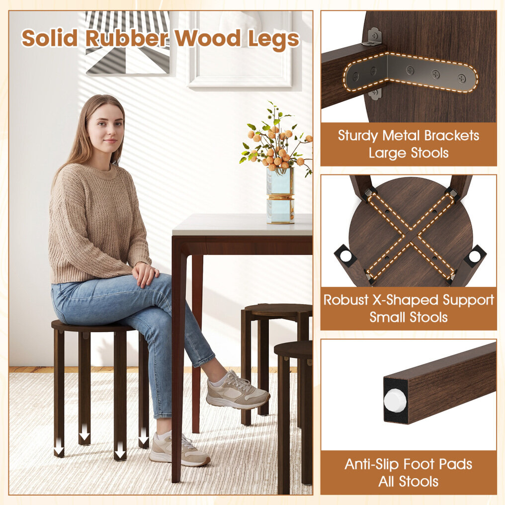 ● Solid Wood Stability: Supported by solid rubber wood legs, the dining chairs hold up to 290 lbs per stool. The large stools use sturdy metal brackets, small stools feature an X-shaped support, and all include anti-slip foot pads for steadier seating.