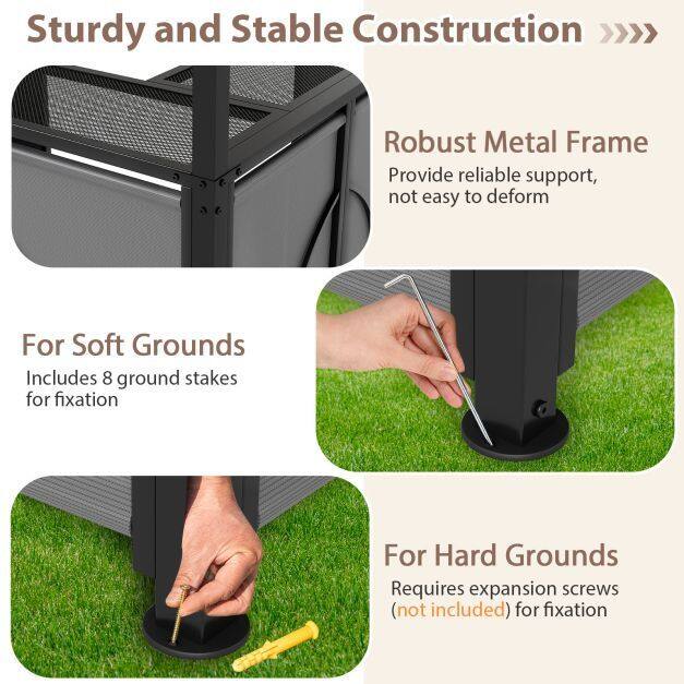 ● Sturdy and Stable Construction: Built to last, the gazebo is supported by a robust metal frame, paired with anchoring plates that can be secured with the included 8 ground stakes, ensuring a stable setup on soft grounds. For hard ground, it requires expansion screws (not included) for fixation.