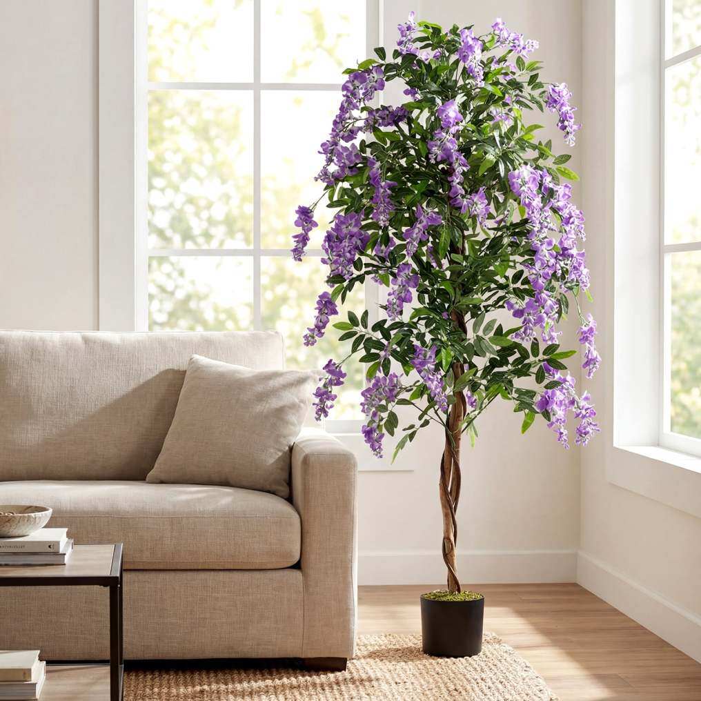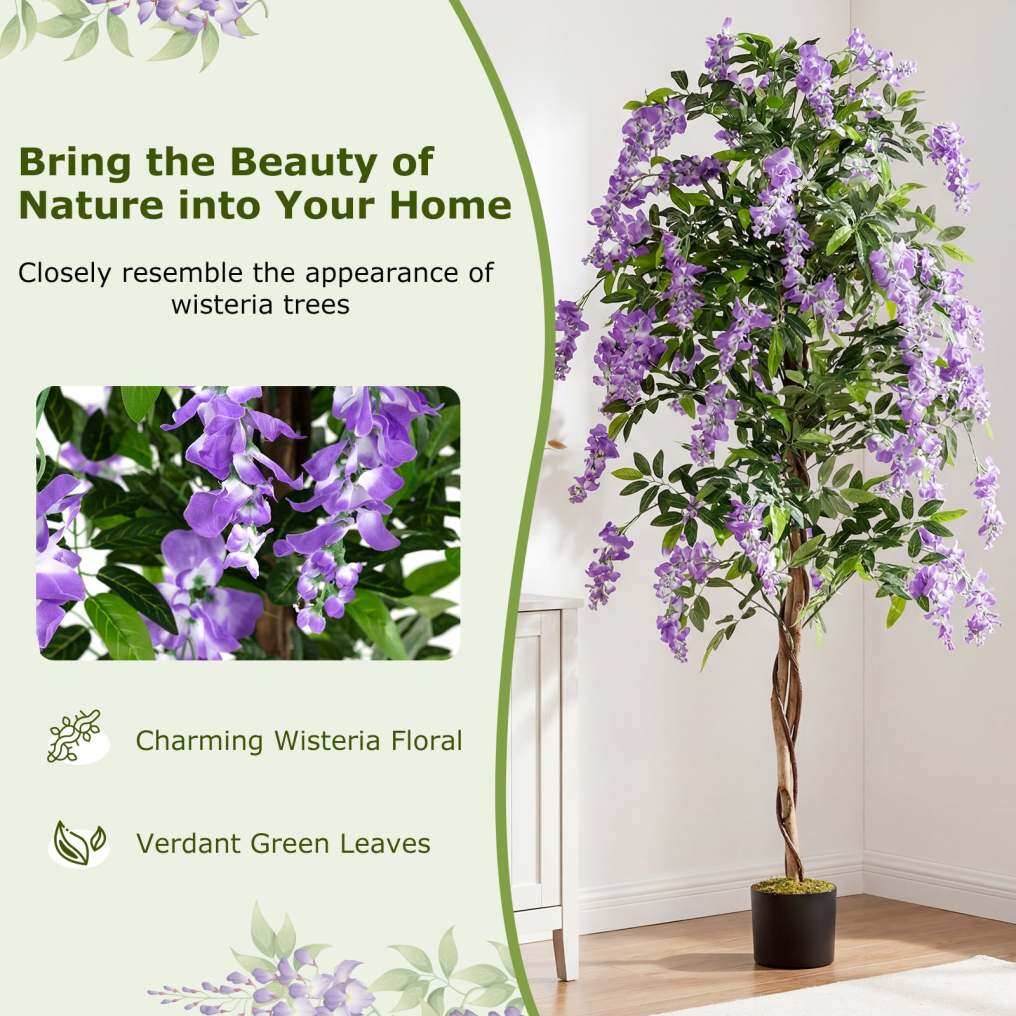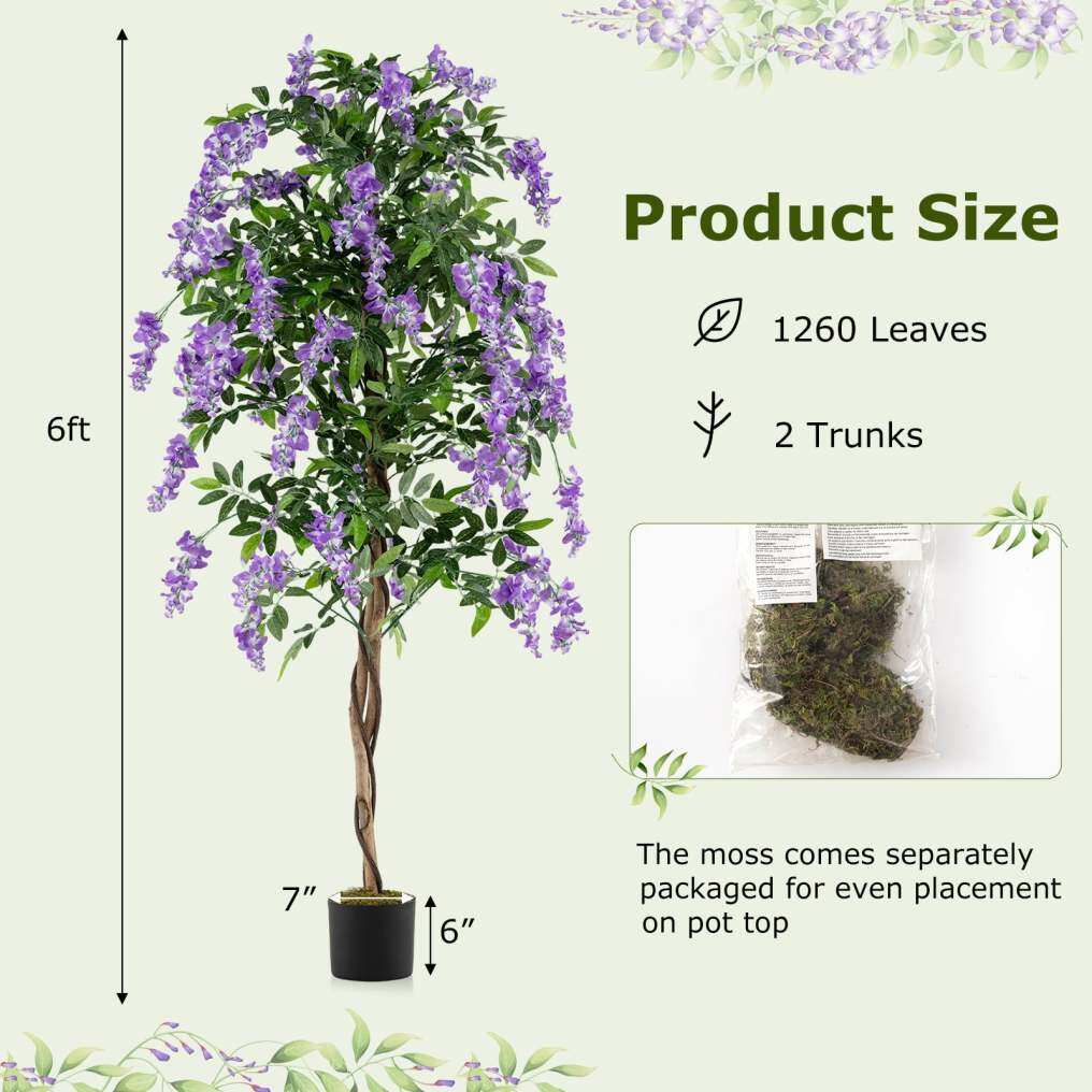 ● Realistic Springtime Wisteria: This 6 ft/180 cm tall artificial tree is adorned with charming wisteria floral and 1260 verdant green leaves, which closely resemble the appearance of wisteria trees for an everlasting spring ambiance in your home.