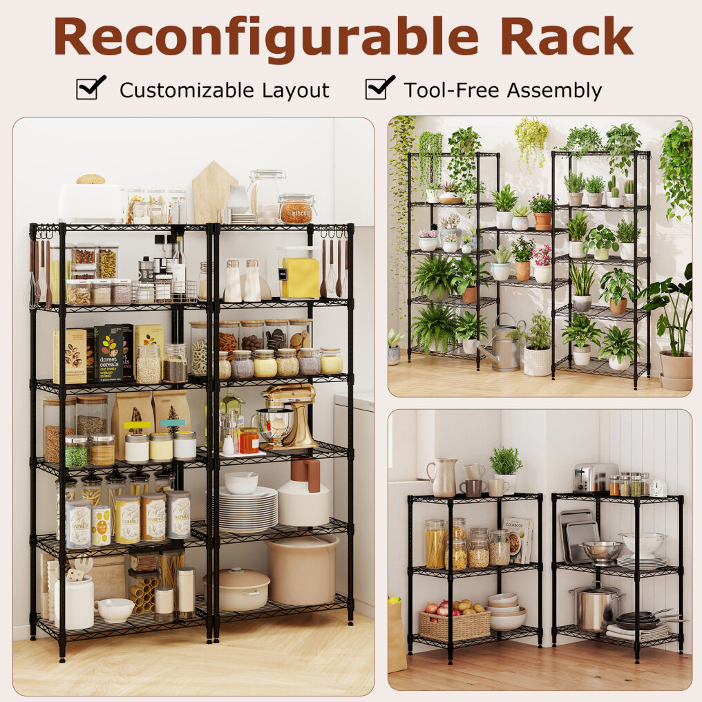 ● Tool-Free Setup & Flexible Layout: The storage rack organizer sets up quickly with no tools required, offering effortless reconfiguration to suit your spaces. Freely connect multiple racks side-by-side, around corners, or bridge them with partial shelves for a unified appearance.