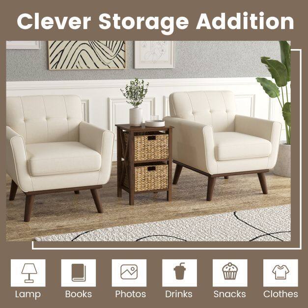 Stay organized with the easily accessible removable drawers. Crafted with solid acacia wood legs and reinforced rubber wood X-shaped frames, this end table ensures great durability. Embrace the natural charm of rustic seagrass baskets, creating a serene bedside ambiance that celebrates the beauty of nature. Its versatility allows you to use it next to your bed, in a guest room, or as a stylish addition to your living area or study. Moreover, the end table is painted for easy maintenance and only requires a simple installation. Elevate your space with this exceptional piece of furniture that combines style and functionality effortlessly. If you are looking for such a product, do not hesitate to buy it!