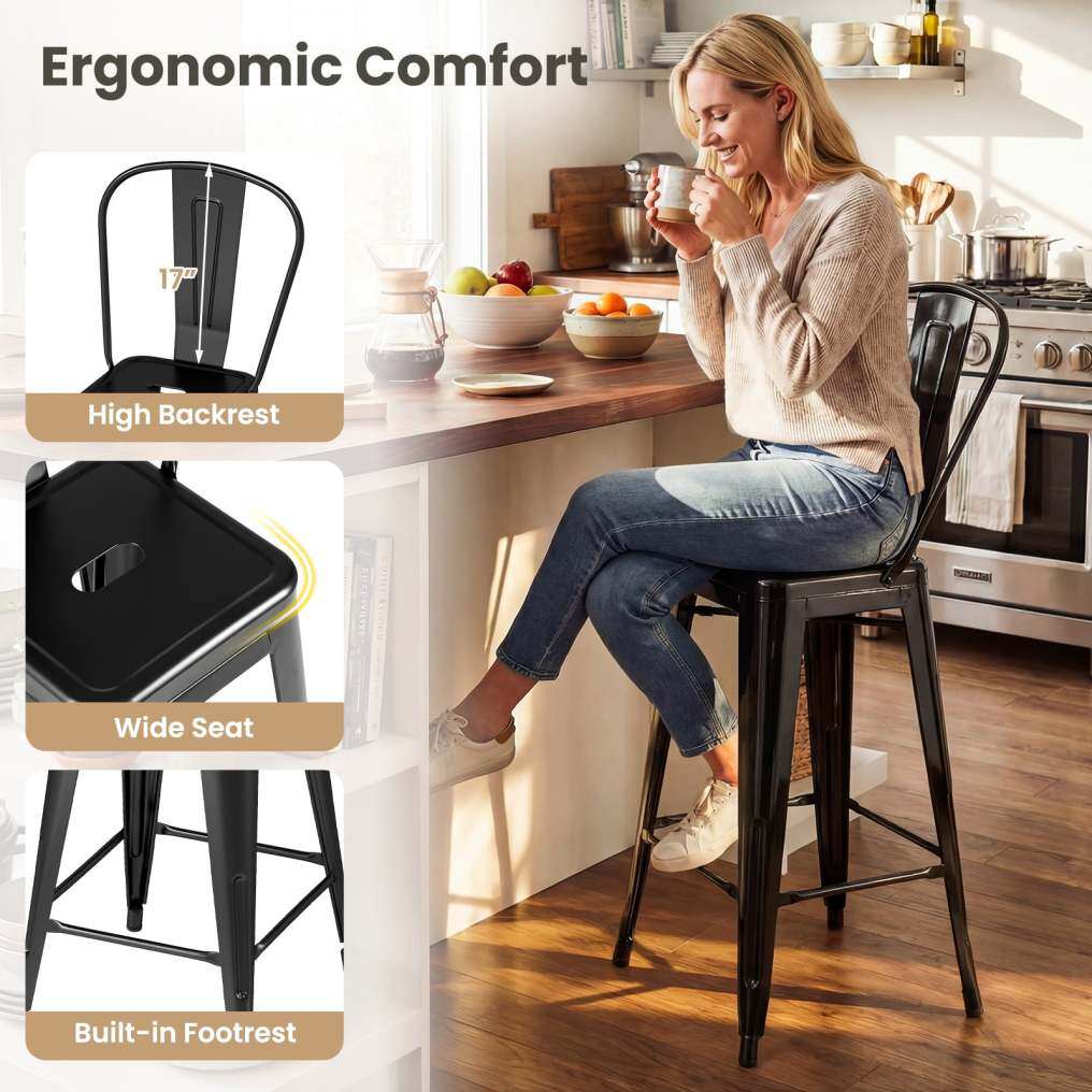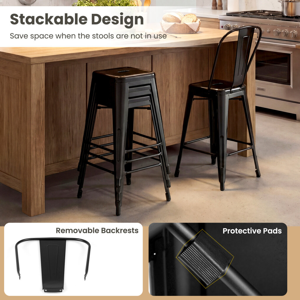 ● Space-saving Stackable Design: These metal bar stools feature a clever stackable design that saves valuable space in your home. By removing the backrests, you can easily stack all 4 stools, while protective pads prevent scratches on the seats.
