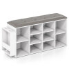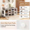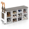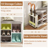 It boasts 10 cubes, ensuring that your shoe collection is not only neatly organized but also easily accessible. Plus, it has 2 3-level adjustable shelves that offer a customized height to match different shoes. But that's not all! This remarkable bench also has a generous side umbrella stand, complete with double 6cm wide holes. Crafted with comfort in mind, the shoe storage bench features a padded seat covered in comfy PU leather & filled with high-density sponge. With a sturdy frame & anti-slip foot pads, the shoe bench ensures exceptional stability. Elevate your space with the elegant design of this shoe storage bench, perfect for any room in your home.