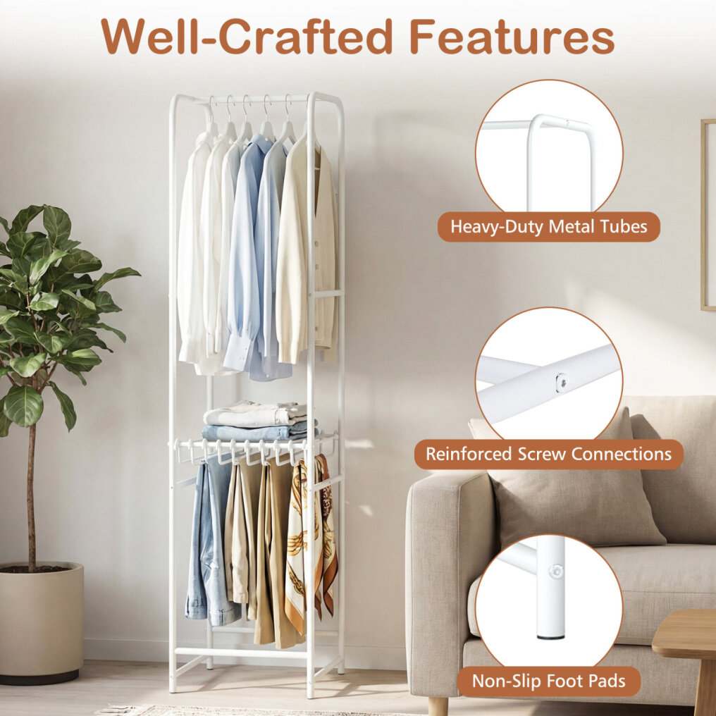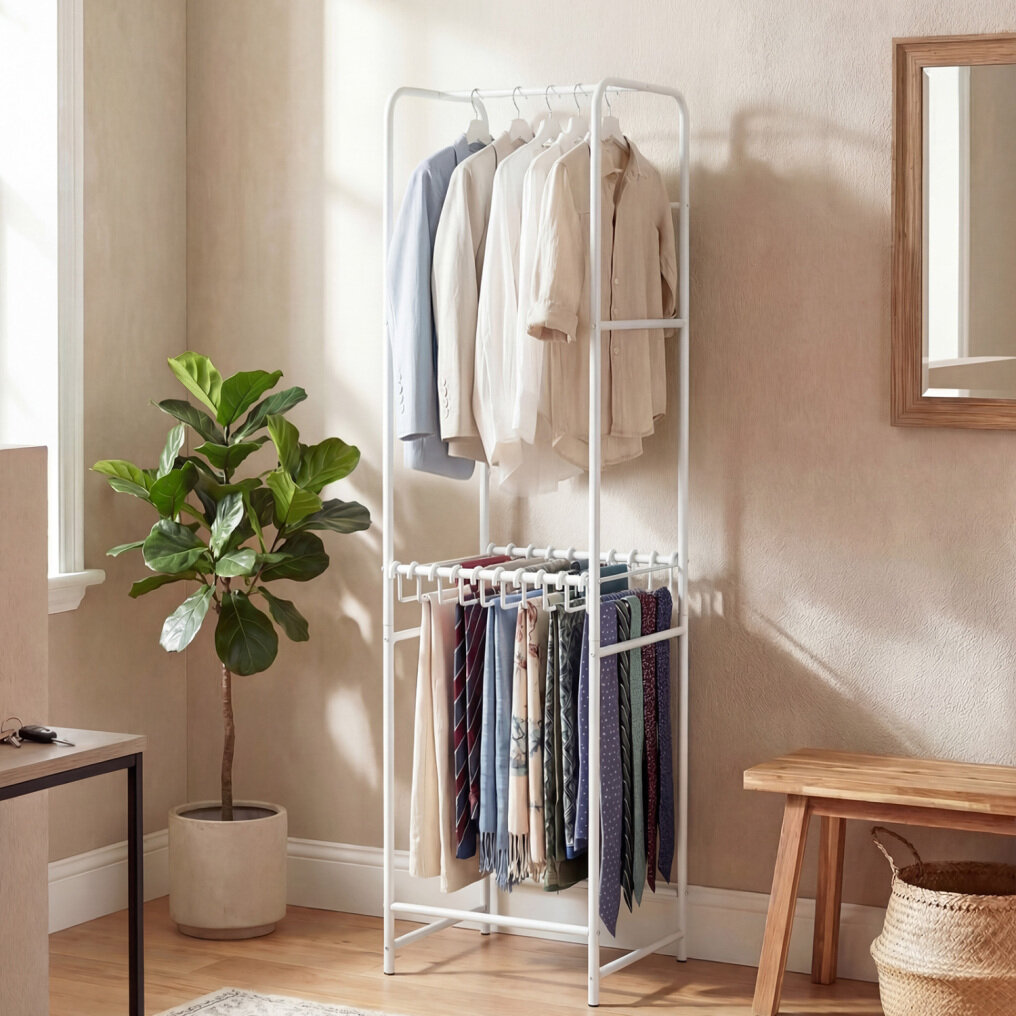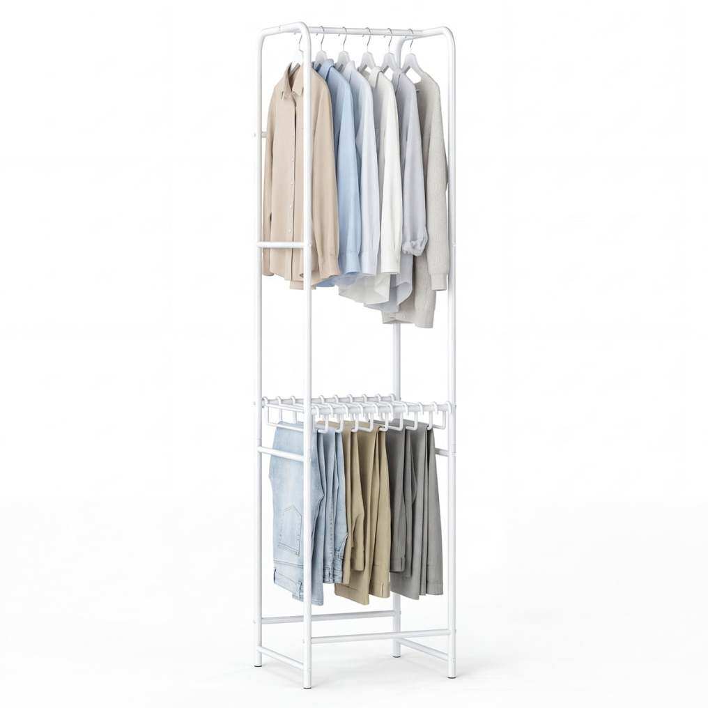 ● Reinforced Stability: Built from heavy-duty metal tubes with powder-coated finish, this clothes stand resists bending and wear. Reinforced screw connections improve overall stability, while non-slip foot pads help protect floors.