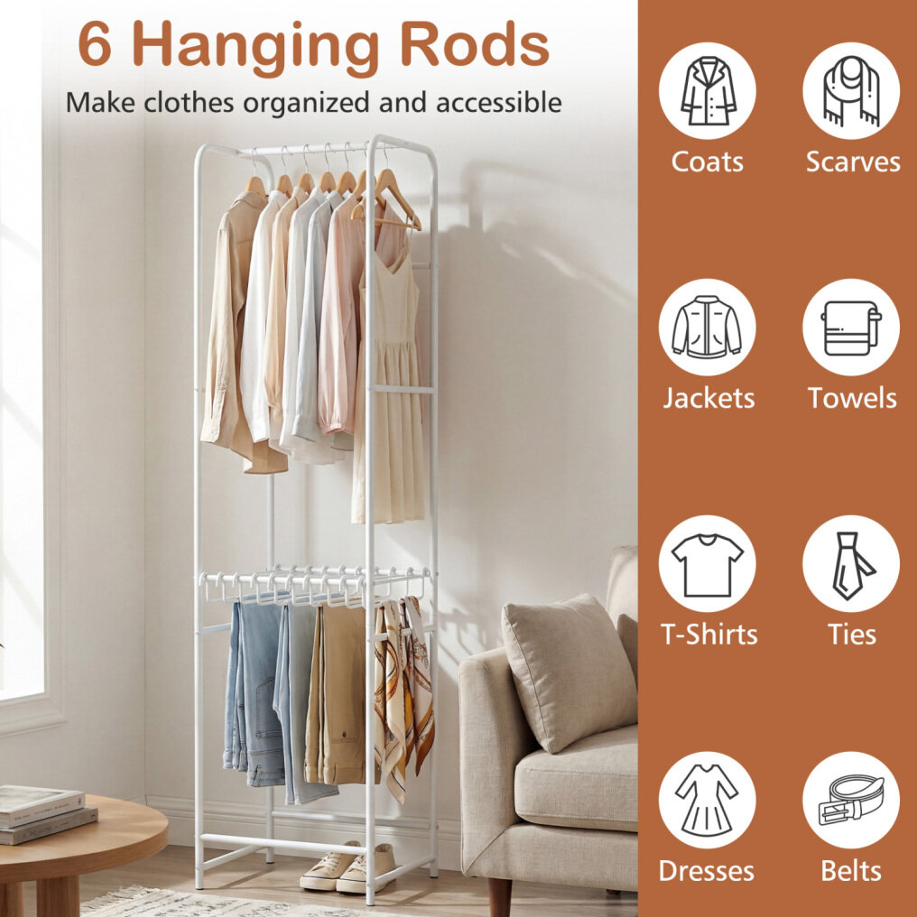 ● Multi-Level Hanging: Featuring 8 hanging rods at different heights, this slim coat rack offers flexible storage for coats, jackets, T-shirts, dresses, scarves, towels, ties, and belts. It keeps everyday essentials visible, organized, and easy to access.