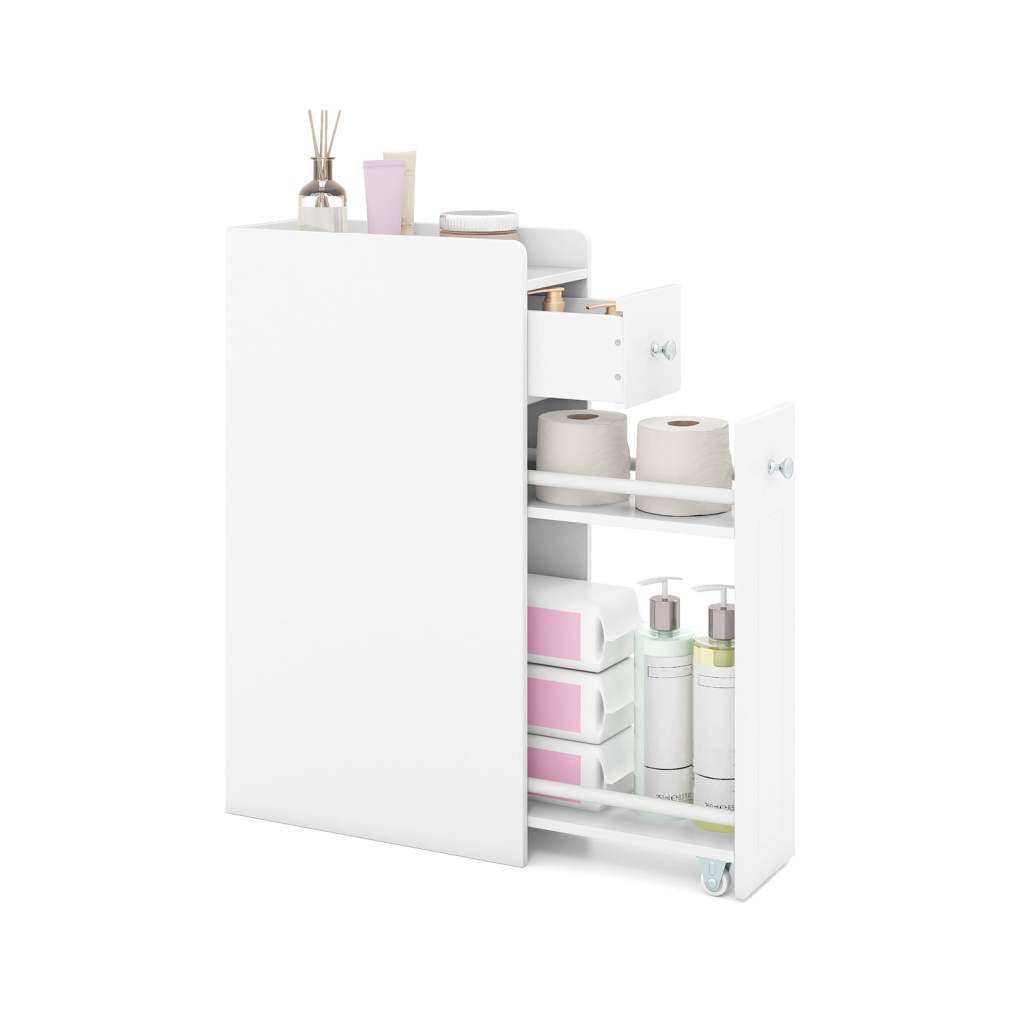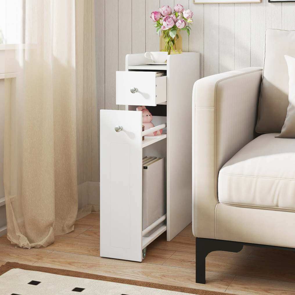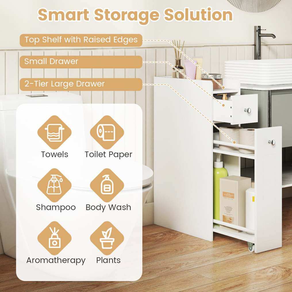 Smart Storage Solution: This slim bathroom storage cabinet features a top shelf with raised edges to prevent items from slipping off, a small drawer for personal items, and a 2-tier large drawer, perfect for organizing all your bathroom essentials.