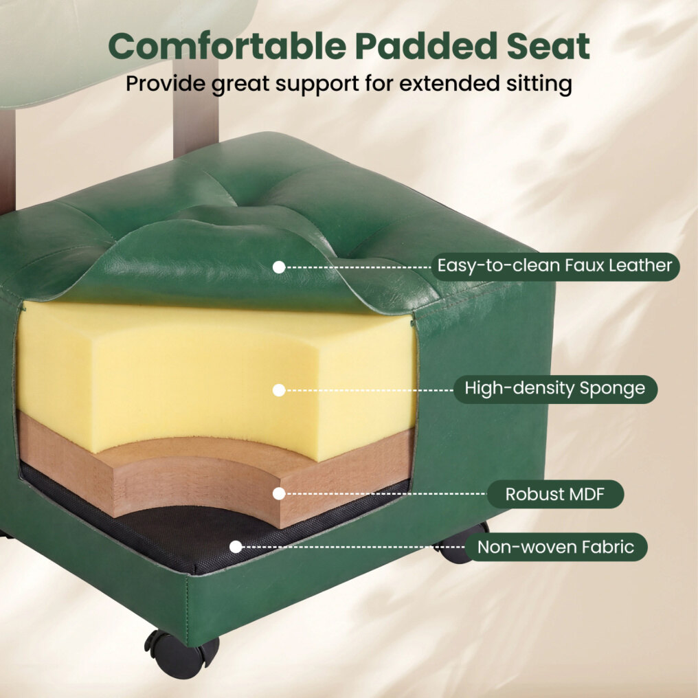 ● Cushioned Comfort: Each small rolling footrest stool features a high-density sponge padded seat and an ergonomic backrest, providing a comfortable and supportive seating experience.