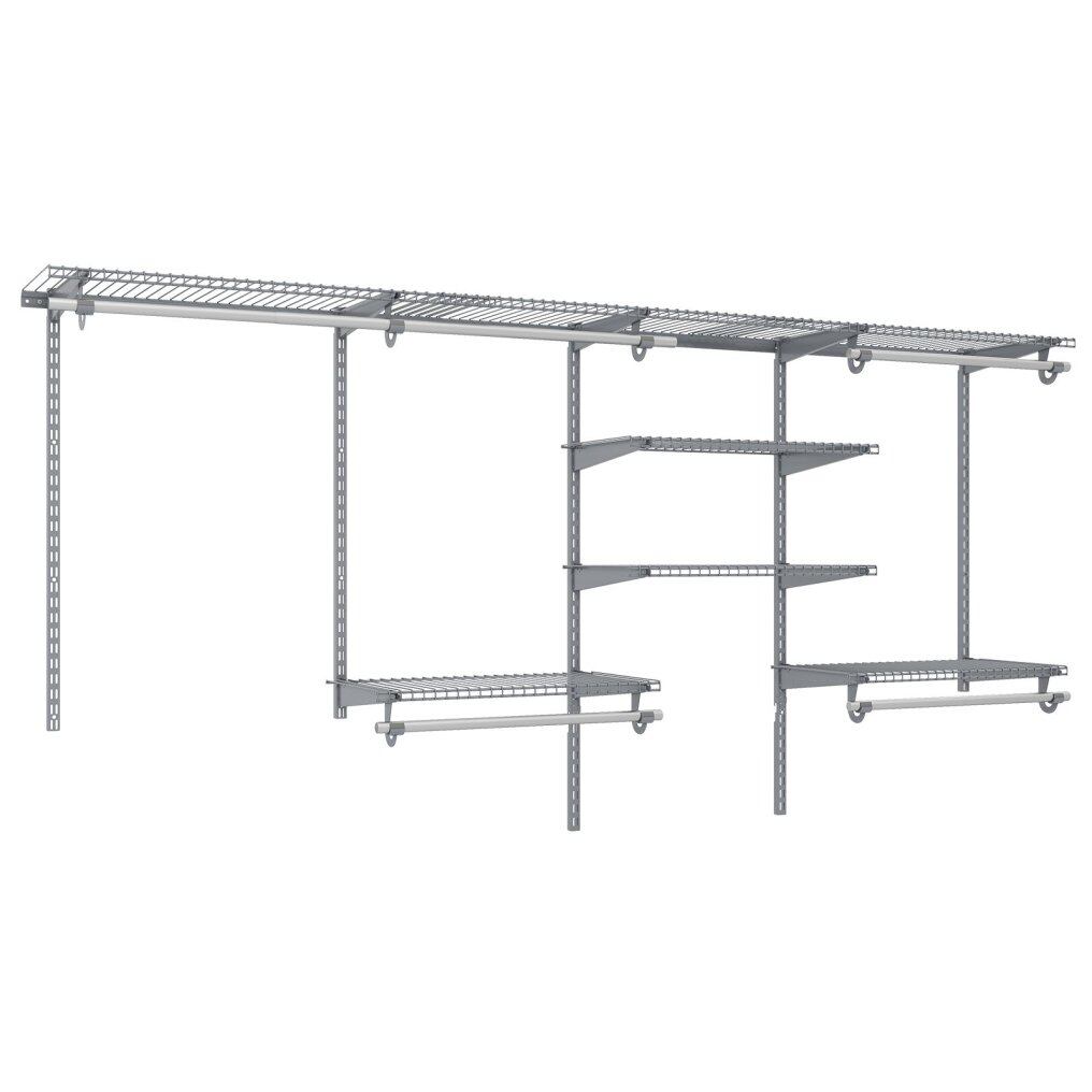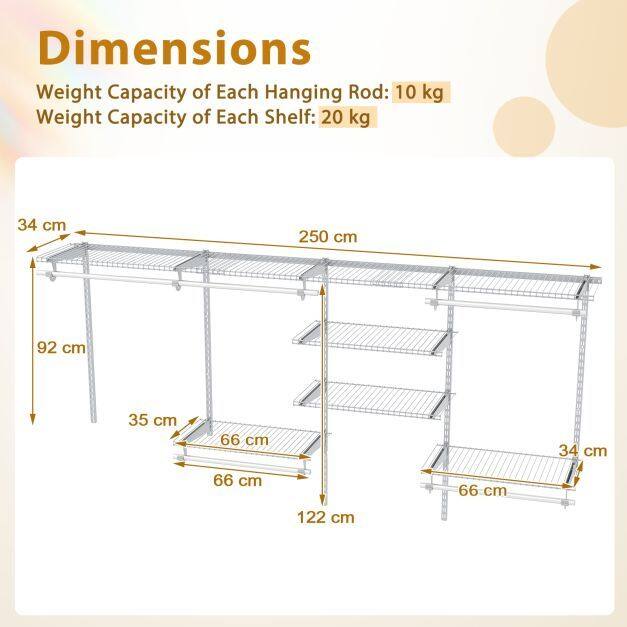 【Plenty of Storage Space】The shelving rail system is equipped with 7 storage shelves and 5 rods, providing up to 380 cm of hanging space and 548 cm of shelf space. Greatly increases storage space for clothes, bags, hats, cushions and other items.