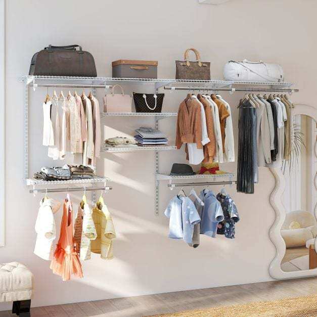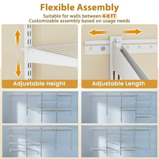 【Flexible Assembly Options】The closet kit offers easy customization for assembly according to user needs. It features adjustable height and length, allowing the shelves to be installed at any position to meet various item storage needs, making it user-friendly and practical.