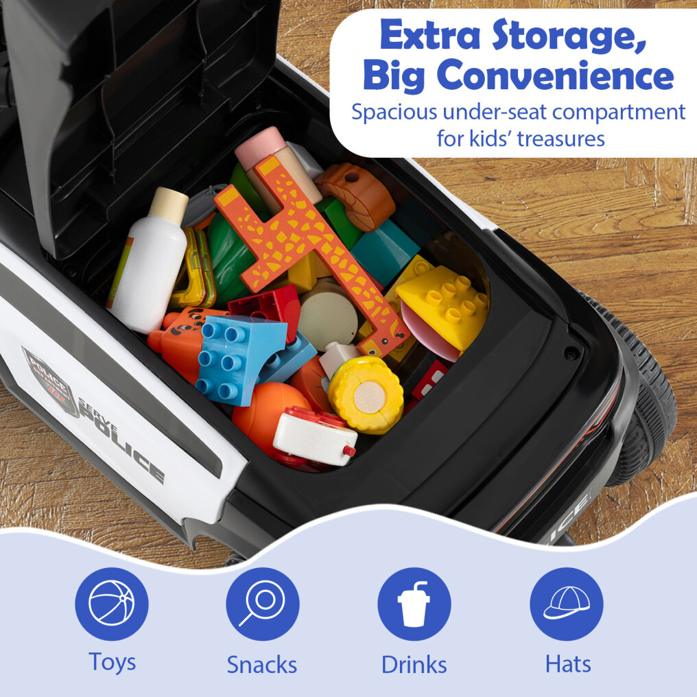 ● Thoughtful Under-Seat Storage: The toddler sliding car comes ingeniously equipped with under-seat storage, allowing your little officer to safely stow away their favorite toys or snacks. Plus, this feature makes it convenient to keep play essentials close at hand during their patrol around the park or home.