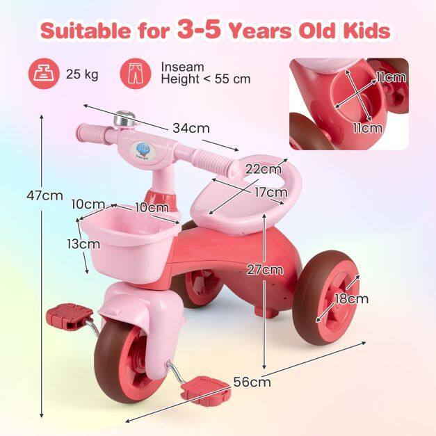 ● Kids-friendly Features: The ergonomic seat on the kids trike is specially shaped, allowing your children to ride comfortably for longer periods. Also, the bell offers extra fun for their riding journey. Additionally, the built-in handle and its lightweight design makes the toddler trike easy to carry for outdoor adventures.