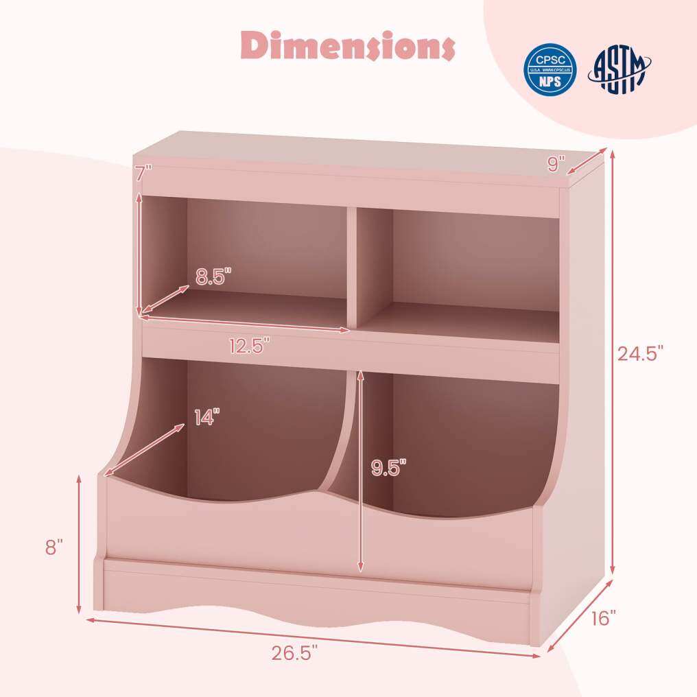 ● Child-friendly Design: This 4-cubby bookcase stands 24.5" tall, making items in every cubby easily accessible for kids. Crafted from safe materials and featuring smooth round corners, it creates a safe environment for young readers and playful toddlers.