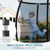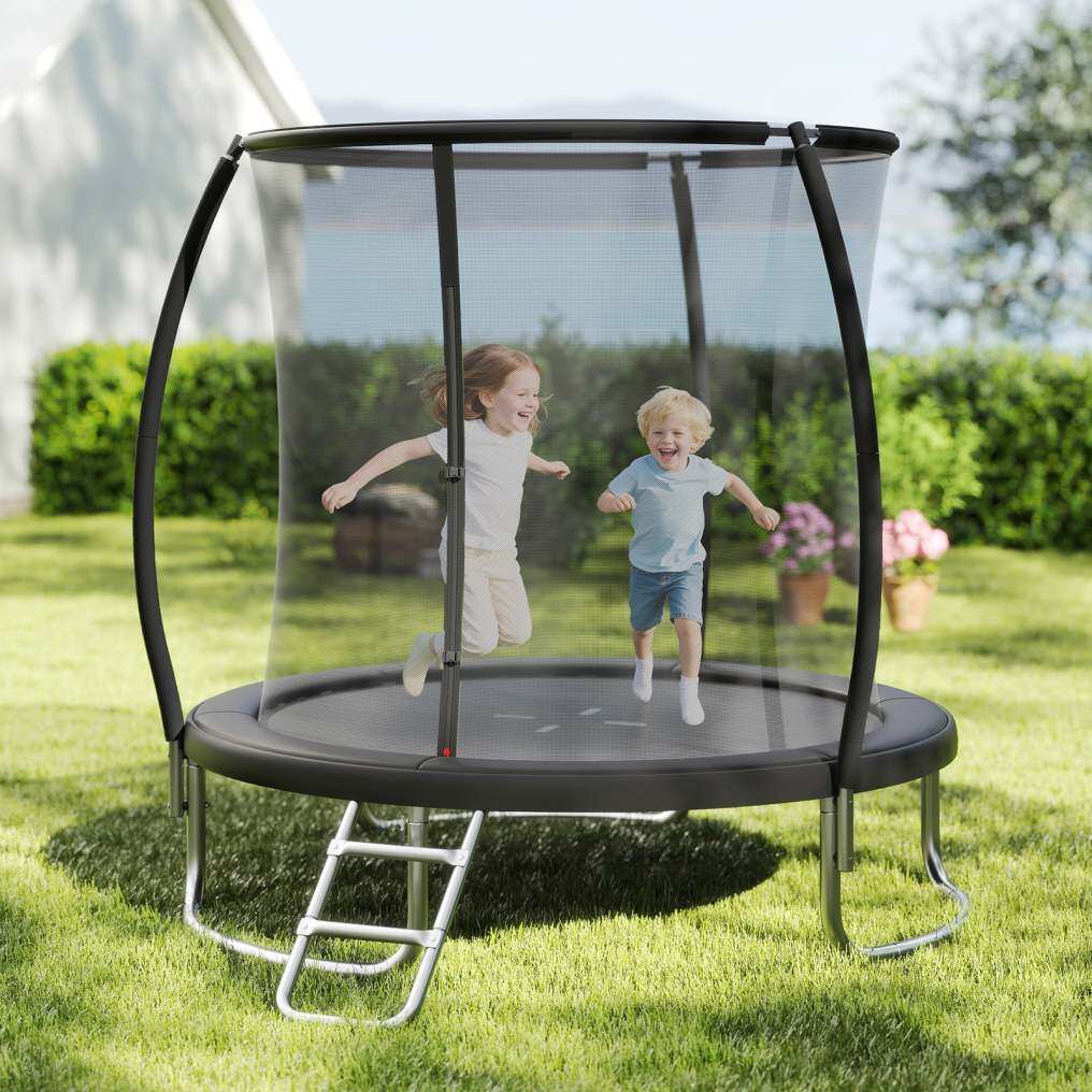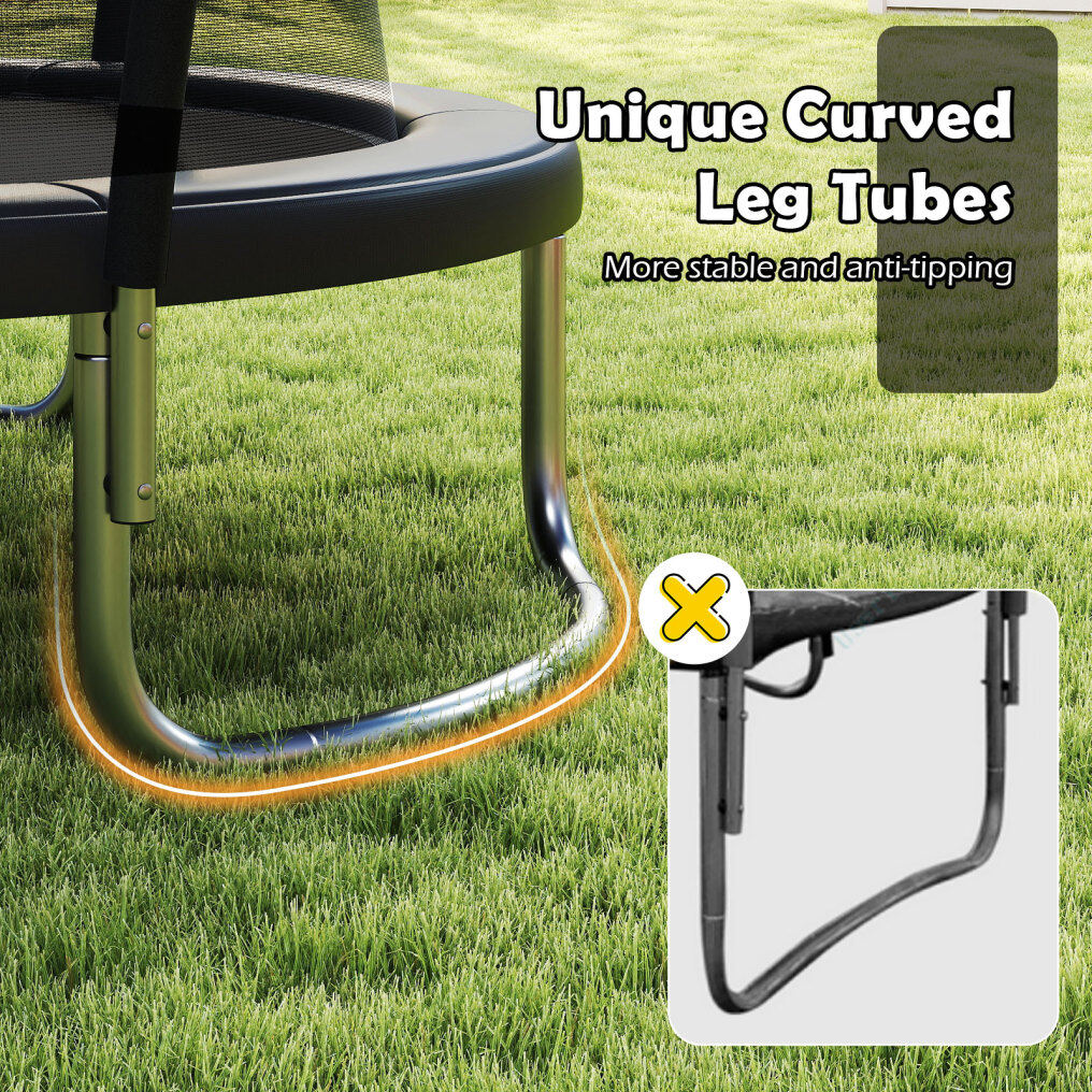 Reliable Safety: More space, more safety. This trampoline features a safety design of curved poles which are wrapped in anti-collision foam sleeves. Moreover, the no-gap design securely attaching the net to the mat, preventing hands and feet from being pinched.