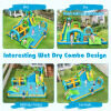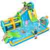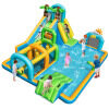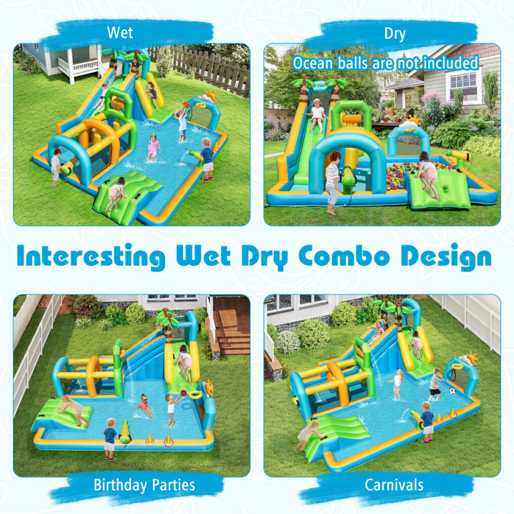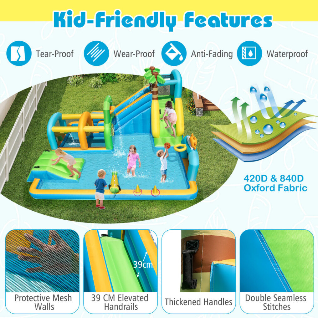 Thrill-Seekers Unite: Get ready for the exciting water adventure with the inflatable water slide! It features a towering palm tree water slide, a challenging climbing wall, a small ramp, a sunshine basketball and football goal, a thrilling obstacle tunnel with a downpour, 2 water cannons, and a ring-toss game – endless fun for active kids!
